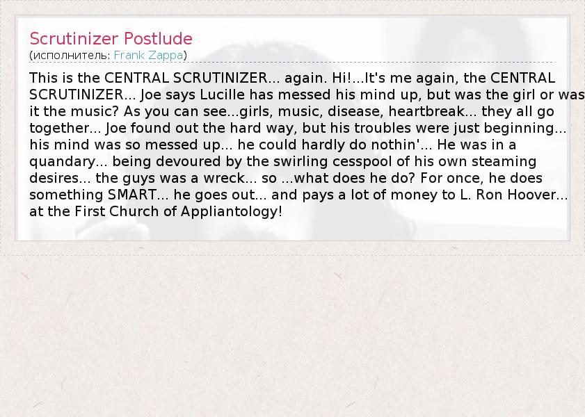 This is the CENTRAL SCRUTINIZER... again. Hi!...It's me again, the CENTRAL SCRUTINIZER... Joe says Lucille has messed his mind up, but was the girl or was it the music? As you can see...girls, music, disease, heartbreak... they all go together... Joe found out the hard way, but his troubles were just beginning... his mind was so messed up... he could hardly do nothin'... He was in a quandary... being devoured by the swirling cesspool of his own steaming desires... the guys was a wreck... so ...what does he do? For once, he does something SMART... he goes out... and pays a lot of money to L. Ron Hoover... at the First Church of Appliantology!