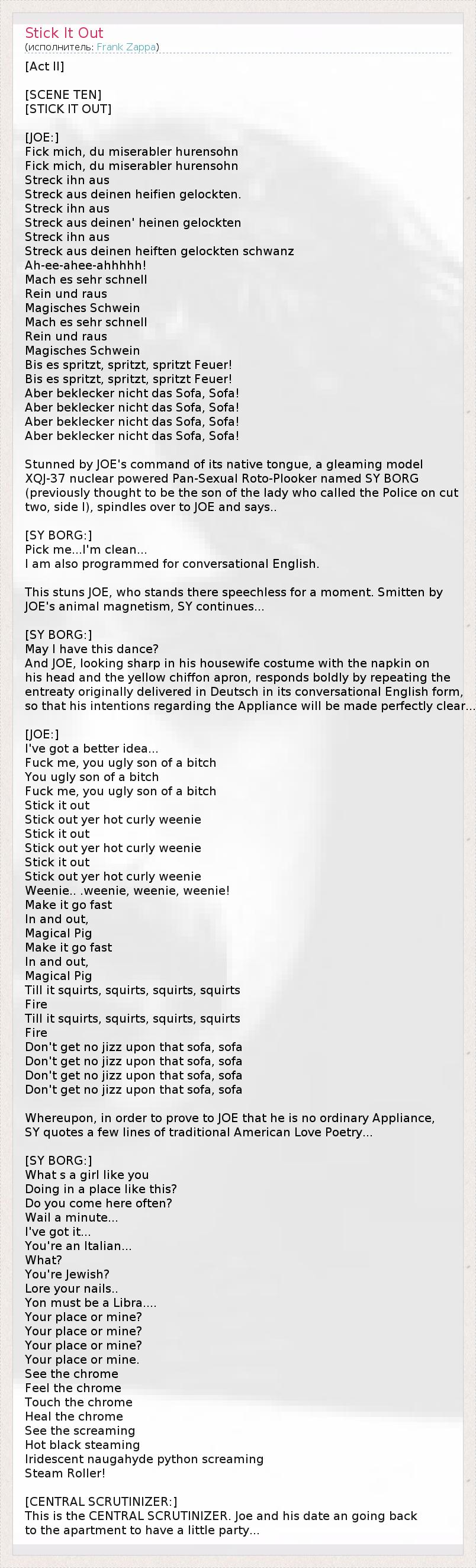 [Act II] [SCENE TEN] [STICK IT OUT] [JOE:] Fick mich, du miserabler hurensohn Fick mich, du miserabler hurensohn Streck ihn aus Streck aus deinen heifien gelockten. Streck ihn aus Streck aus deinen' heinen gelockten Streck ihn aus Streck aus deinen heiften gelockten schwanz Ah-ee-ahee-ahhhhh! Mach es sehr schnell Rein und raus Magisches Schwein Mach es sehr schnell Rein und raus Magisches Schwein Bis es spritzt, spritzt, spritzt Feuer! Bis es spritzt, spritzt, spritzt Feuer! Aber beklecker nicht das Sofa, Sofa! Aber beklecker nicht das Sofa, Sofa! Aber beklecker nicht das Sofa, Sofa! Aber beklecker nicht das Sofa, Sofa! Stunned by JOE's command of its native tongue, a gleaming model XQJ-37 nuclear powered Pan-Sexual Roto-Plooker named SY BORG (previously thought to be the son of the lady who called the Police on cut two, side I), spindles over to JOE and says.. [SY BORG:] Pick me...I'm clean... I am also programmed for conversational English. This stuns JOE, who stands there speechless for a moment. Smitten by JOE's animal magnetism, SY continues... [SY BORG:] May I have this dance? And JOE, looking sharp in his housewife costume with the napkin on his head and the yellow chiffon apron, responds boldly by repeating the entreaty originally delivered in Deutsch in its conversational English form, so that his intentions regarding the Appliance will be made perfectly clear... [JOE:] I've got a better idea... Fuck me, you ugly son of a bitch You ugly son of a bitch Fuck me, you ugly son of a bitch Stick it out Stick out yer hot curly weenie Stick it out Stick out yer hot curly weenie Stick it out Stick out yer hot curly weenie Weenie.. .weenie, weenie, weenie! Make it go fast In and out, Magical Pig Make it go fast In and out, Magical Pig Till it squirts, squirts, squirts, squirts Fire Till it squirts, squirts, squirts, squirts Fire Don't get no jizz upon that sofa, sofa Don't get no jizz upon that sofa, sofa Don't get no jizz upon that sofa, sofa Don't get no jizz upon that sofa, sofa Whereupon, in order to prove to JOE that he is no ordinary Appliance, SY quotes a few lines of traditional American Love Poetry... [SY BORG:] What s a girl like you Doing in a place like this? Do you come here often? Wail a minute... I've got it... You're an Italian... What? You're Jewish? Lore your nails.. Yon must be a Libra.... Your place or mine? Your place or mine? Your place or mine? Your place or mine. See the chrome Feel the chrome Touch the chrome Heal the chrome See the screaming Hot black steaming Iridescent naugahyde python screaming Steam Roller! [CENTRAL SCRUTINIZER:] This is the CENTRAL SCRUTINIZER. Joe and his date an going back to the apartment to have a little party...