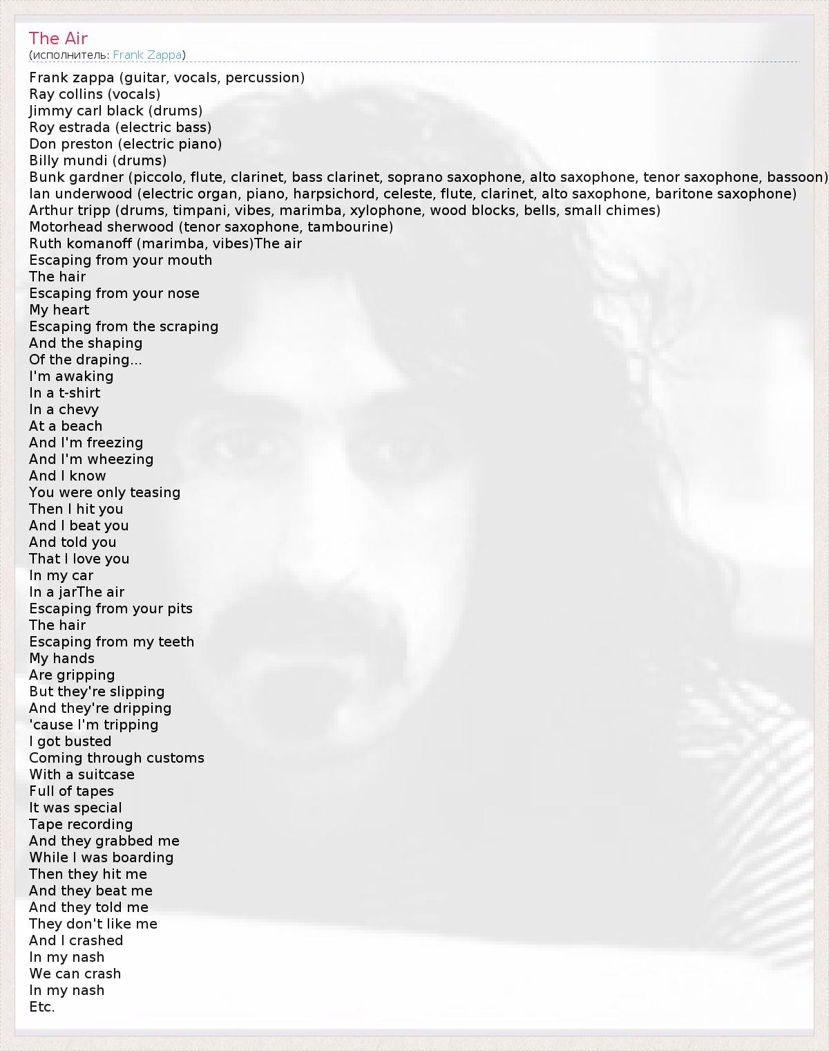 Frank zappa (guitar, vocals, percussion) Ray collins (vocals) Jimmy carl black (drums) Roy estrada (electric bass) Don preston (electric piano) Billy mundi (drums) Bunk gardner (piccolo, flute, clarinet, bass clarinet, soprano saxophone, alto saxophone, tenor saxophone, bassoon) Ian underwood (electric organ, piano, harpsichord, celeste, flute, clarinet, alto saxophone, baritone saxophone) Arthur tripp (drums, timpani, vibes, marimba, xylophone, wood blocks, bells, small chimes) Motorhead sherwood (tenor saxophone, tambourine) Ruth komanoff (marimba, vibes)The air Escaping from your mouth The hair Escaping from your nose My heart Escaping from the scraping And the shaping Of the draping... I'm awaking In a t-shirt In a chevy At a beach And I'm freezing And I'm wheezing And I know You were only teasing Then I hit you And I beat you And told you That I love you In my car In a jarThe air Escaping from your pits The hair Escaping from my teeth My hands Are gripping But they're slipping And they're dripping 'cause I'm tripping I got busted Coming through customs With a suitcase Full of tapes It was special Tape recording And they grabbed me While I was boarding Then they hit me And they beat me And they told me They don't like me And I crashed In my nash We can crash In my nash Etc.