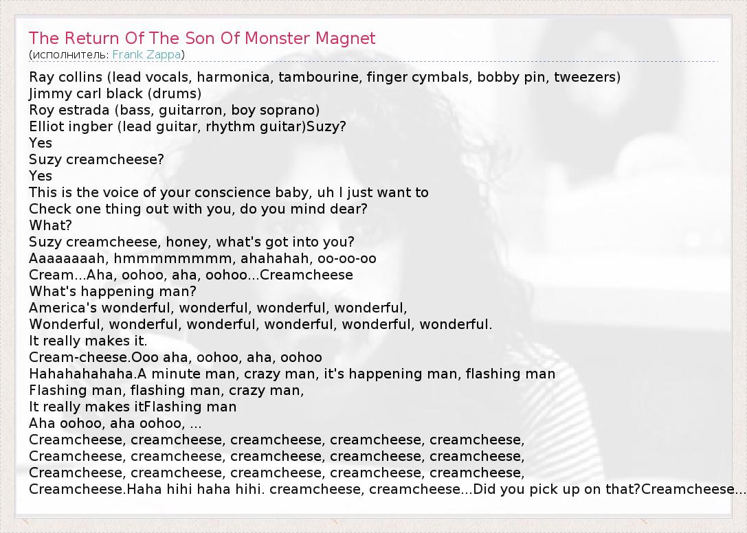 Ray collins (lead vocals, harmonica, tambourine, finger cymbals, bobby pin, tweezers) Jimmy carl black (drums) Roy estrada (bass, guitarron, boy soprano) Elliot ingber (lead guitar, rhythm guitar)Suzy? Yes Suzy creamcheese? Yes This is the voice of your conscience baby, uh I just want to Check one thing out with you, do you mind dear? What? Suzy creamcheese, honey, what's got into you? Aaaaaaaah, hmmmmmmmm, ahahahah, oo-oo-oo Cream...Aha, oohoo, aha, oohoo...Creamcheese What's happening man? America's wonderful, wonderful, wonderful, wonderful, Wonderful, wonderful, wonderful, wonderful, wonderful, wonderful. It really makes it. Cream-cheese.Ooo aha, oohoo, aha, oohoo Hahahahahaha.A minute man, crazy man, it's happening man, flashing man Flashing man, flashing man, crazy man, It really makes itFlashing man Aha oohoo, aha oohoo, ... Creamcheese, creamcheese, creamcheese, creamcheese, creamcheese, Creamcheese, creamcheese, creamcheese, creamcheese, creamcheese, Creamcheese, creamcheese, creamcheese, creamcheese, creamcheese, Creamcheese.Haha hihi haha hihi. creamcheese, creamcheese...Did you pick up on that?Creamcheese...