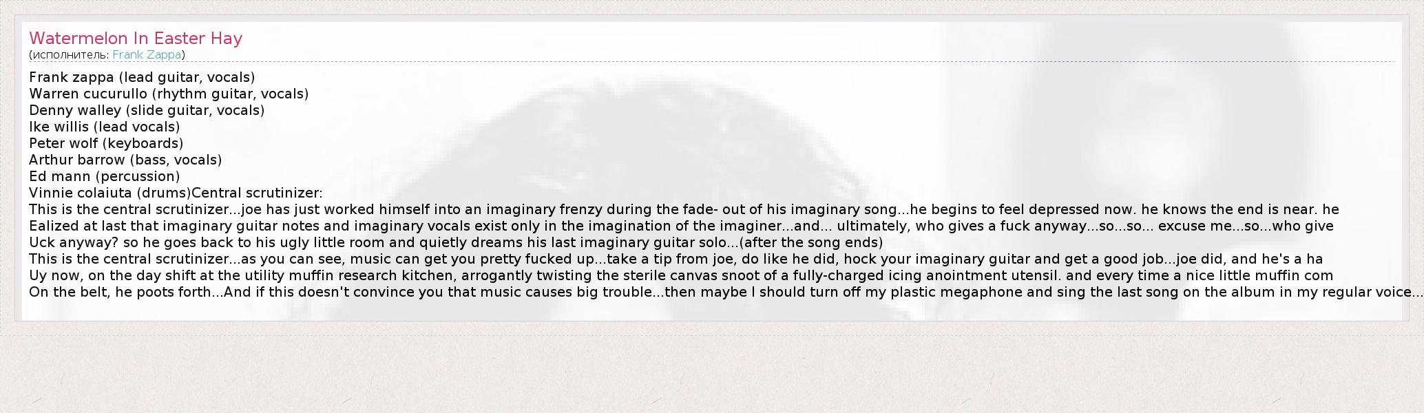 Frank zappa (lead guitar, vocals) Warren cucurullo (rhythm guitar, vocals) Denny walley (slide guitar, vocals) Ike willis (lead vocals) Peter wolf (keyboards) Arthur barrow (bass, vocals) Ed mann (percussion) Vinnie colaiuta (drums)Central scrutinizer: This is the central scrutinizer...joe has just worked himself into an imaginary frenzy during the fade- out of his imaginary song...he begins to feel depressed now. he knows the end is near. he Ealized at last that imaginary guitar notes and imaginary vocals exist only in the imagination of the imaginer...and... ultimately, who gives a fuck anyway...so...so... excuse me...so...who give Uck anyway? so he goes back to his ugly little room and quietly dreams his last imaginary guitar solo...(after the song ends) This is the central scrutinizer...as you can see, music can get you pretty fucked up...take a tip from joe, do like he did, hock your imaginary guitar and get a good job...joe did, and he's a ha Uy now, on the day shift at the utility muffin research kitchen, arrogantly twisting the sterile canvas snoot of a fully-charged icing anointment utensil. and every time a nice little muffin com On the belt, he poots forth...And if this doesn't convince you that music causes big trouble...then maybe I should turn off my plastic megaphone and sing the last song on the album in my regular voice...