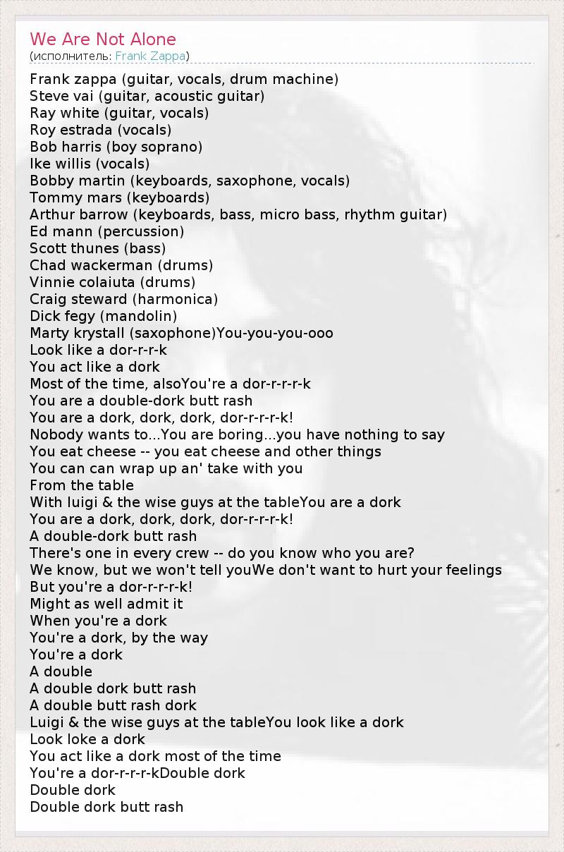 Frank zappa (guitar, vocals, drum machine) Steve vai (guitar, acoustic guitar) Ray white (guitar, vocals) Roy estrada (vocals) Bob harris (boy soprano) Ike willis (vocals) Bobby martin (keyboards, saxophone, vocals) Tommy mars (keyboards) Arthur barrow (keyboards, bass, micro bass, rhythm guitar) Ed mann (percussion) Scott thunes (bass) Chad wackerman (drums) Vinnie colaiuta (drums) Craig steward (harmonica) Dick fegy (mandolin) Marty krystall (saxophone)You-you-you-ooo Look like a dor-r-r-k You act like a dork Most of the time, alsoYou're a dor-r-r-r-k You are a double-dork butt rash You are a dork, dork, dork, dor-r-r-r-k! Nobody wants to...You are boring...you have nothing to say You eat cheese -- you eat cheese and other things You can can wrap up an' take with you From the table With luigi & the wise guys at the tableYou are a dork You are a dork, dork, dork, dor-r-r-r-k! A double-dork butt rash There's one in every crew -- do you know who you are? We know, but we won't tell youWe don't want to hurt your feelings But you're a dor-r-r-r-k! Might as well admit it When you're a dork You're a dork, by the way You're a dork A double A double dork butt rash A double butt rash dork Luigi & the wise guys at the tableYou look like a dork Look loke a dork You act like a dork most of the time You're a dor-r-r-r-kDouble dork Double dork Double dork butt rash