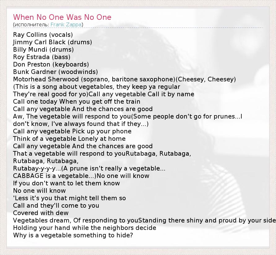 Это интересно:Фрэнк Винсент Заппа (англ. Frank Vincent Zappa, 21 декабря 1940 — 4 декабря 1993) — легендарный американский композитор, гитарист, певец, кинорежиссёр и сатирик. Был руководителем рок-группы The Mothers of Invention. Лауреат премии «Грэмми».За свою 33-летнюю музыкальную карьеру Заппа показал себя одним из самых плодовитых композиторов своей эпохи, выпустив более шестидесяти альбомов, почти все из... продолжение