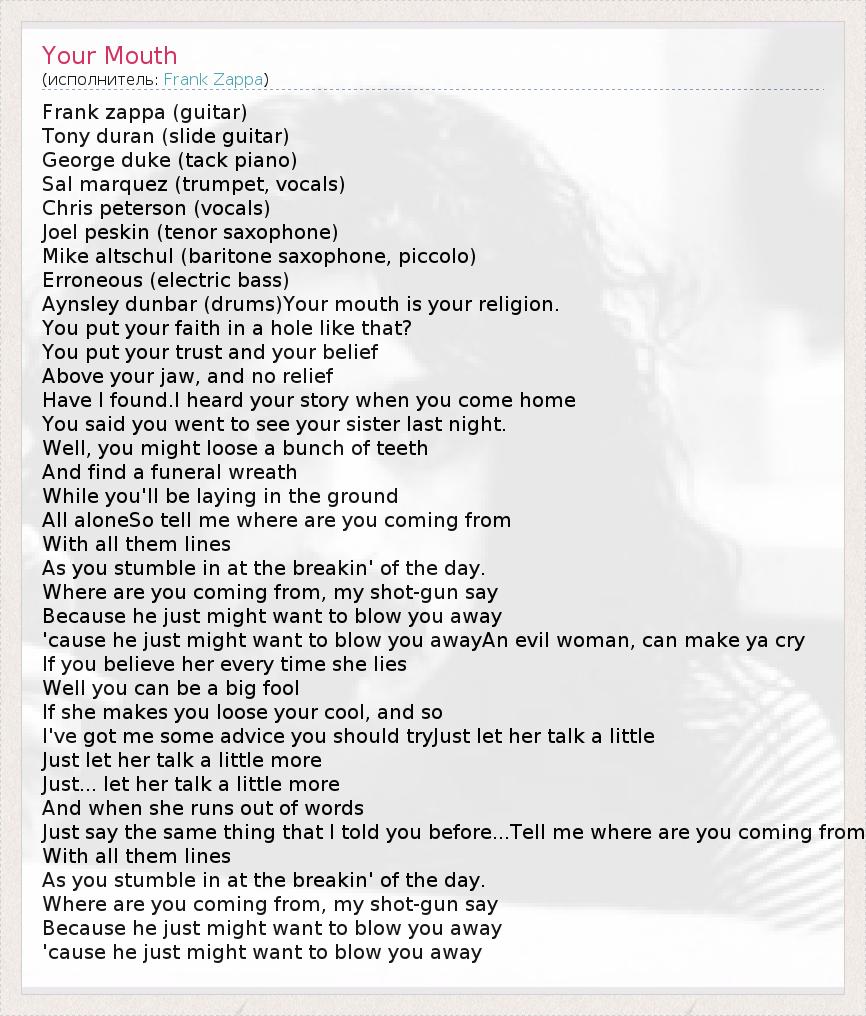 Frank zappa (guitar) Tony duran (slide guitar) George duke (tack piano) Sal marquez (trumpet, vocals) Chris peterson (vocals) Joel peskin (tenor saxophone) Mike altschul (baritone saxophone, piccolo) Erroneous (electric bass) Aynsley dunbar (drums)Your mouth is your religion. You put your faith in a hole like that? You put your trust and your belief Above your jaw, and no relief Have I found.I heard your story when you come home You said you went to see your sister last night. Well, you might loose a bunch of teeth And find a funeral wreath While you'll be laying in the ground All aloneSo tell me where are you coming from With all them lines As you stumble in at the breakin' of the day. Where are you coming from, my shot-gun say Because he just might want to blow you away 'cause he just might want to blow you awayAn evil woman, can make ya cry If you believe her every time she lies Well you can be a big fool If she makes you loose your cool, and so I've got me some advice you should tryJust let her talk a little Just let her talk a little more Just... let her talk a little more And when she runs out of words Just say the same thing that I told you before...Tell me where are you coming from With all them lines As you stumble in at the breakin' of the day. Where are you coming from, my shot-gun say Because he just might want to blow you away 'cause he just might want to blow you away