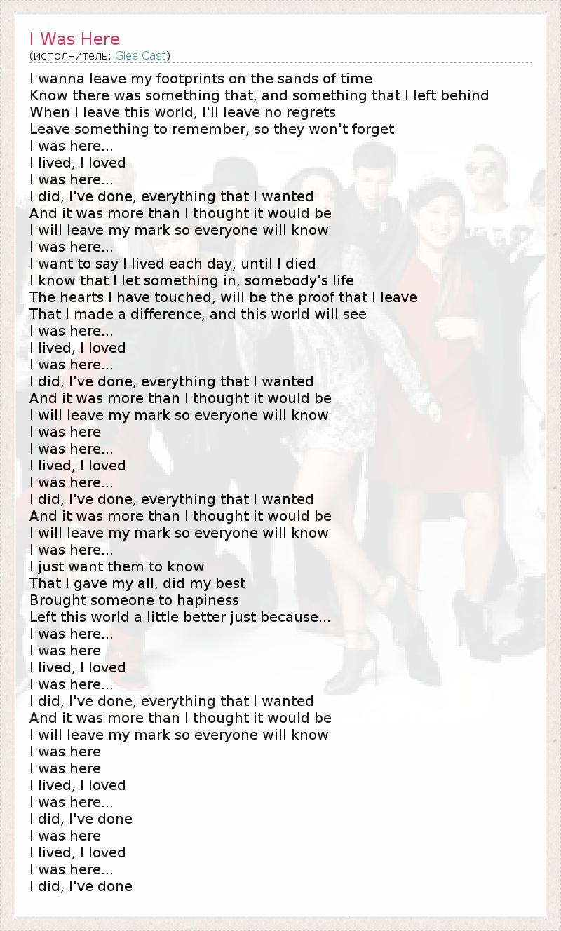 I wanna leave my footprints on the sands of time Know there was something that, and something that I left behind When I leave this world, I'll leave no regrets Leave something to remember, so they won't forget I was here... I lived, I loved I was here... I did, I've done, everything that I wanted And it was more than I thought it would be I will leave my mark so everyone will know I was here... I want to say I lived each day, until I died I know that I let something in, somebody's life The hearts I have touched, will be the proof that I leave That I made a difference, and this world will see I was here... I lived, I loved I was here... I did, I've done, everything that I wanted And it was more than I thought it would be I will leave my mark so everyone will know I was here I was here... I lived, I loved I was here... I did, I've done, everything that I wanted And it was more than I thought it would be I will leave my mark so everyone will know I was here... I just want them to know That I gave my all, did my best Brought someone to hapiness Left this world a little better just because... I was here... I was here I lived, I loved I was here... I did, I've done, everything that I wanted And it was more than I thought it would be I will leave my mark so everyone will know I was here I was here I lived, I loved I was here... I did, I've done I was here I lived, I loved I was here... I did, I've done
