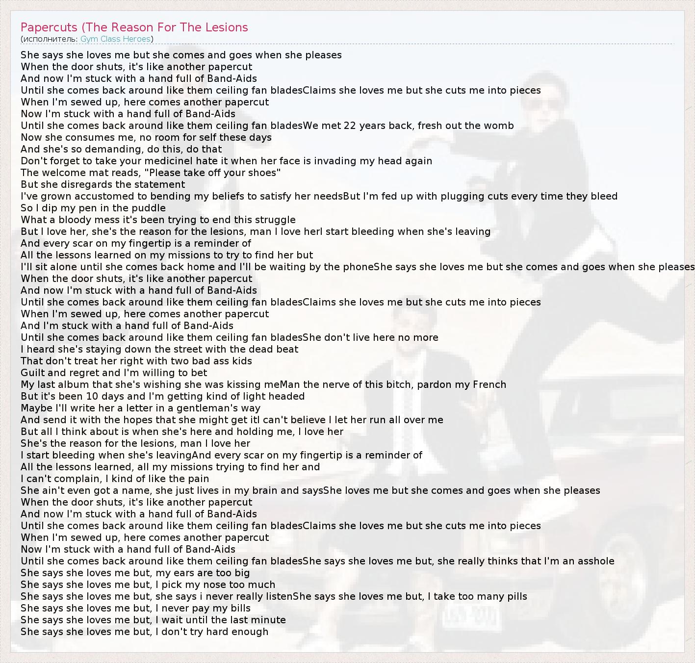 She says she loves me but she comes and goes when she pleases When the door shuts, it's like another papercut And now I'm stuck with a hand full of Band-Aids Until she comes back around like them ceiling fan bladesClaims she loves me but she cuts me into pieces When I'm sewed up, here comes another papercut Now I'm stuck with a hand full of Band-Aids Until she comes back around like them ceiling fan bladesWe met 22 years back, fresh out the womb Now she consumes me, no room for self these days And she's so demanding, do this, do that Don't forget to take your medicineI hate it when her face is invading my head again The welcome mat reads, "Please take off your shoes" But she disregards the statement I've grown accustomed to bending my beliefs to satisfy her needsBut I'm fed up with plugging cuts every time they bleed So I dip my pen in the puddle What a bloody mess it's been trying to end this struggle But I love her, she's the reason for the lesions, man I love herI start bleeding when she's leaving And every scar on my fingertip is a reminder of All the lessons learned on my missions to try to find her but I'll sit alone until she comes back home and I'll be waiting by the phoneShe says she loves me but she comes and goes when she pleases When the door shuts, it's like another papercut And now I'm stuck with a hand full of Band-Aids Until she comes back around like them ceiling fan bladesClaims she loves me but she cuts me into pieces When I'm sewed up, here comes another papercut And I'm stuck with a hand full of Band-Aids Until she comes back around like them ceiling fan bladesShe don't live here no more I heard she's staying down the street with the dead beat That don't treat her right with two bad ass kids Guilt and regret and I'm willing to bet My last album that she's wishing she was kissing meMan the nerve of this bitch, pardon my French But it's been 10 days and I'm getting kind of light headed Maybe I'll write her a letter in a gentleman's way And send it with the hopes that she might get itI can't believe I let her run all over me But all I think about is when she's here and holding me, I love her She's the reason for the lesions, man I love her I start bleeding when she's leavingAnd every scar on my fingertip is a reminder of All the lessons learned, all my missions trying to find her and I can't complain, I kind of like the pain She ain't even got a name, she just lives in my brain and saysShe loves me but she comes and goes when she pleases When the door shuts, it's like another papercut And now I'm stuck with a hand full of Band-Aids Until she comes back around like them ceiling fan bladesClaims she loves me but she cuts me into pieces When I'm sewed up, here comes another papercut Now I'm stuck with a hand full of Band-Aids Until she comes back around like them ceiling fan bladesShe says she loves me but, she really thinks that I'm an asshole She says she loves me but, my ears are too big She says she loves me but, I pick my nose too much She says she loves me but, she says i never really listenShe says she loves me but, I take too many pills She says she loves me but, I never pay my bills She says she loves me but, I wait until the last minute She says she loves me but, I don't try hard enough