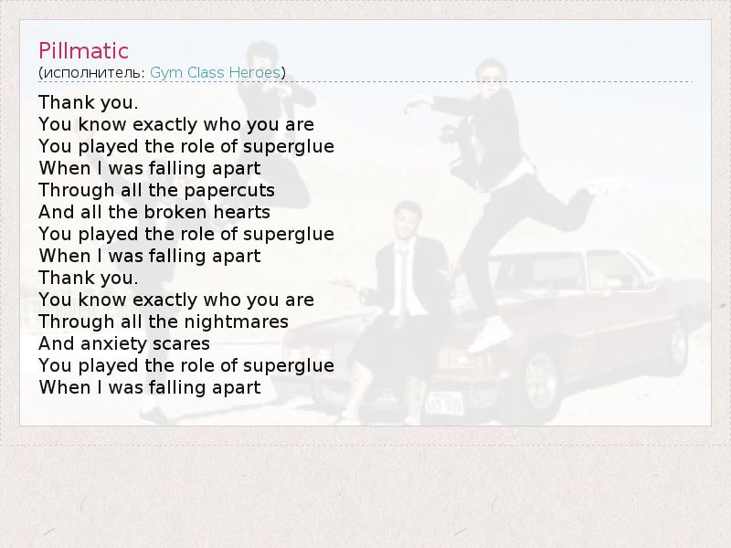 Thank you. You know exactly who you are You played the role of superglue When I was falling apart Through all the papercuts And all the broken hearts You played the role of superglue When I was falling apart Thank you. You know exactly who you are Through all the nightmares And anxiety scares You played the role of superglue When I was falling apart
