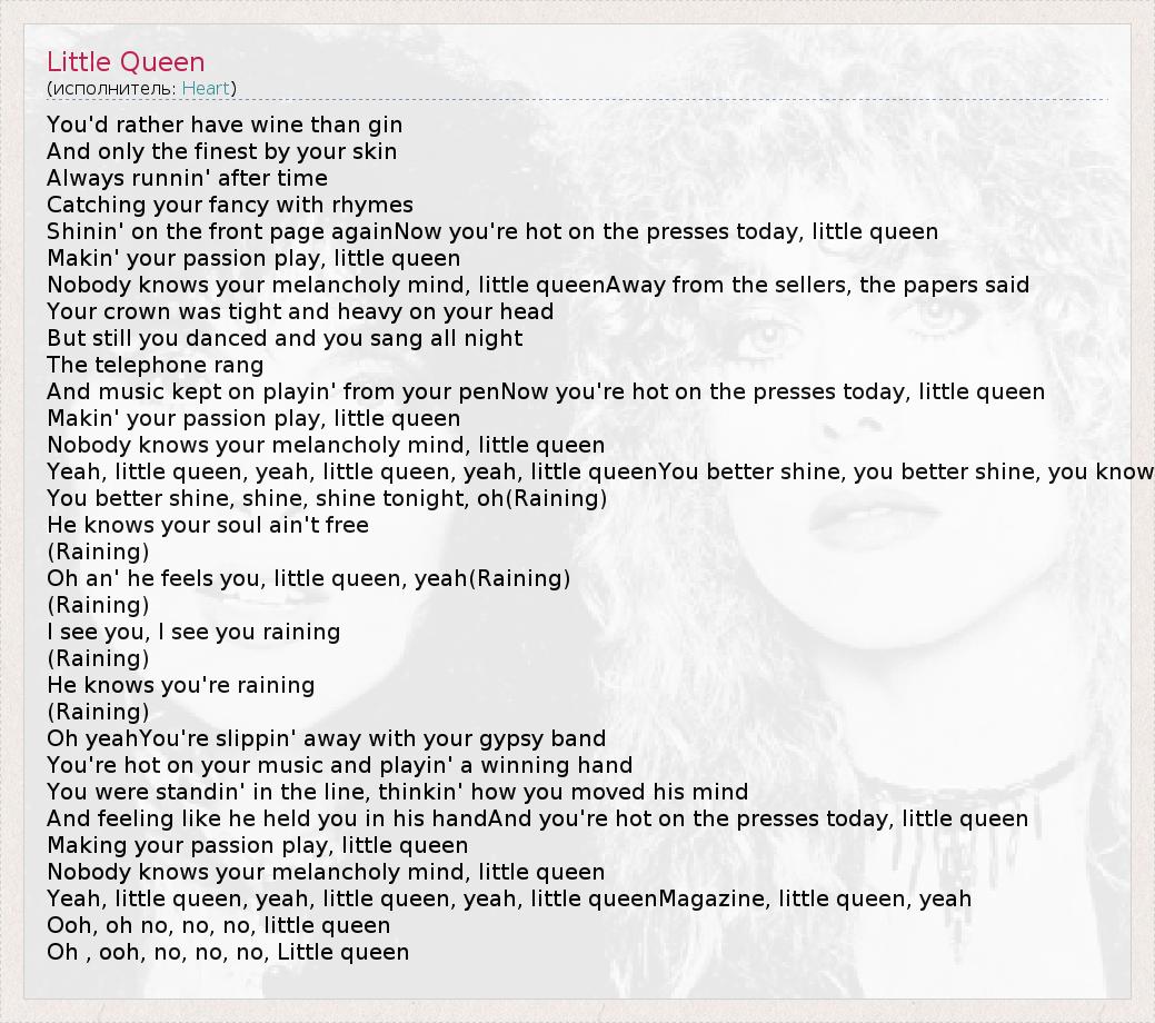 You'd rather have wine than gin And only the finest by your skin Always runnin' after time Catching your fancy with rhymes Shinin' on the front page againNow you're hot on the presses today, little queen Makin' your passion play, little queen Nobody knows your melancholy mind, little queenAway from the sellers, the papers said Your crown was tight and heavy on your head But still you danced and you sang all night The telephone rang And music kept on playin' from your penNow you're hot on the presses today, little queen Makin' your passion play, little queen Nobody knows your melancholy mind, little queen Yeah, little queen, yeah, little queen, yeah, little queenYou better shine, you better shine, you know You better shine, shine, shine tonight, oh(Raining) He knows your soul ain't free (Raining) Oh an' he feels you, little queen, yeah(Raining) (Raining) I see you, I see you raining (Raining) He knows you're raining (Raining) Oh yeahYou're slippin' away with your gypsy band You're hot on your music and playin' a winning hand You were standin' in the line, thinkin' how you moved his mind And feeling like he held you in his handAnd you're hot on the presses today, little queen Making your passion play, little queen Nobody knows your melancholy mind, little queen Yeah, little queen, yeah, little queen, yeah, little queenMagazine, little queen, yeah Ooh, oh no, no, no, little queen Oh , ooh, no, no, no, Little queen