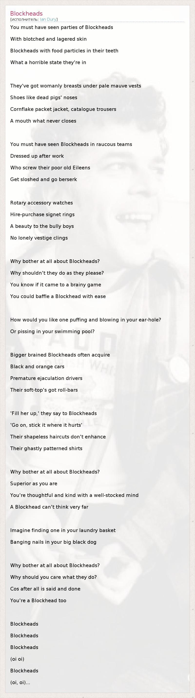 Это интересно:Иэн Дьюри - британский автор и рок-исполнитель, начинавший в паб-роке, добившийся успеха на волне панк-рока и оставшийся в истории уникальным рок-н-ролльным поэтом-эксцентриком, даже самую тяжелую тему умевшим подать в юмористическом ключе на обманчиво простецком кокни, за которым скрывались огромная душевная теплота и интеллигентность.Иэн Робин Дьюри (Ian Robin Dury) родился в Хэрроу-Уилд,... продолжение