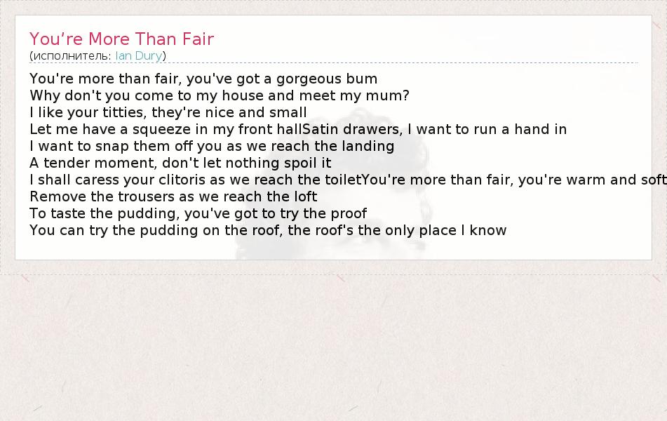 You're more than fair, you've got a gorgeous bum Why don't you come to my house and meet my mum? I like your titties, they're nice and small Let me have a squeeze in my front hallSatin drawers, I want to run a hand in I want to snap them off you as we reach the landing A tender moment, don't let nothing spoil it I shall caress your clitoris as we reach the toiletYou're more than fair, you're warm and soft Remove the trousers as we reach the loft To taste the pudding, you've got to try the proof You can try the pudding on the roof, the roof's the only place I know