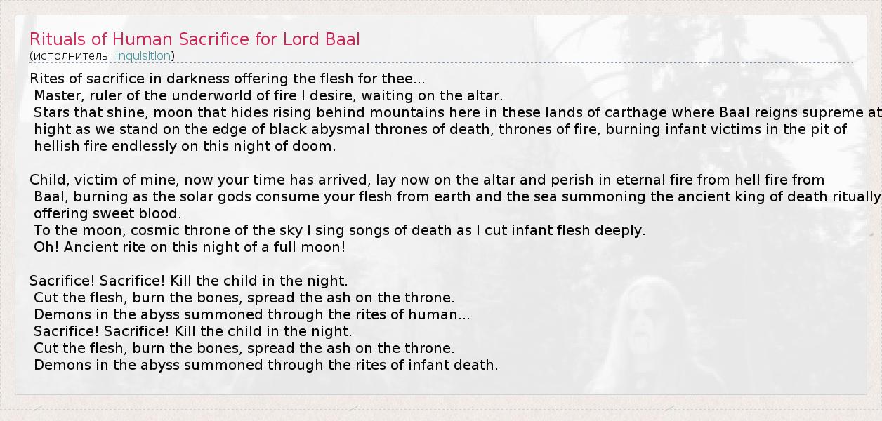 А как ты думаешь, о чем песня "Rituals of Human Sacrifice for Lord Baal" ?