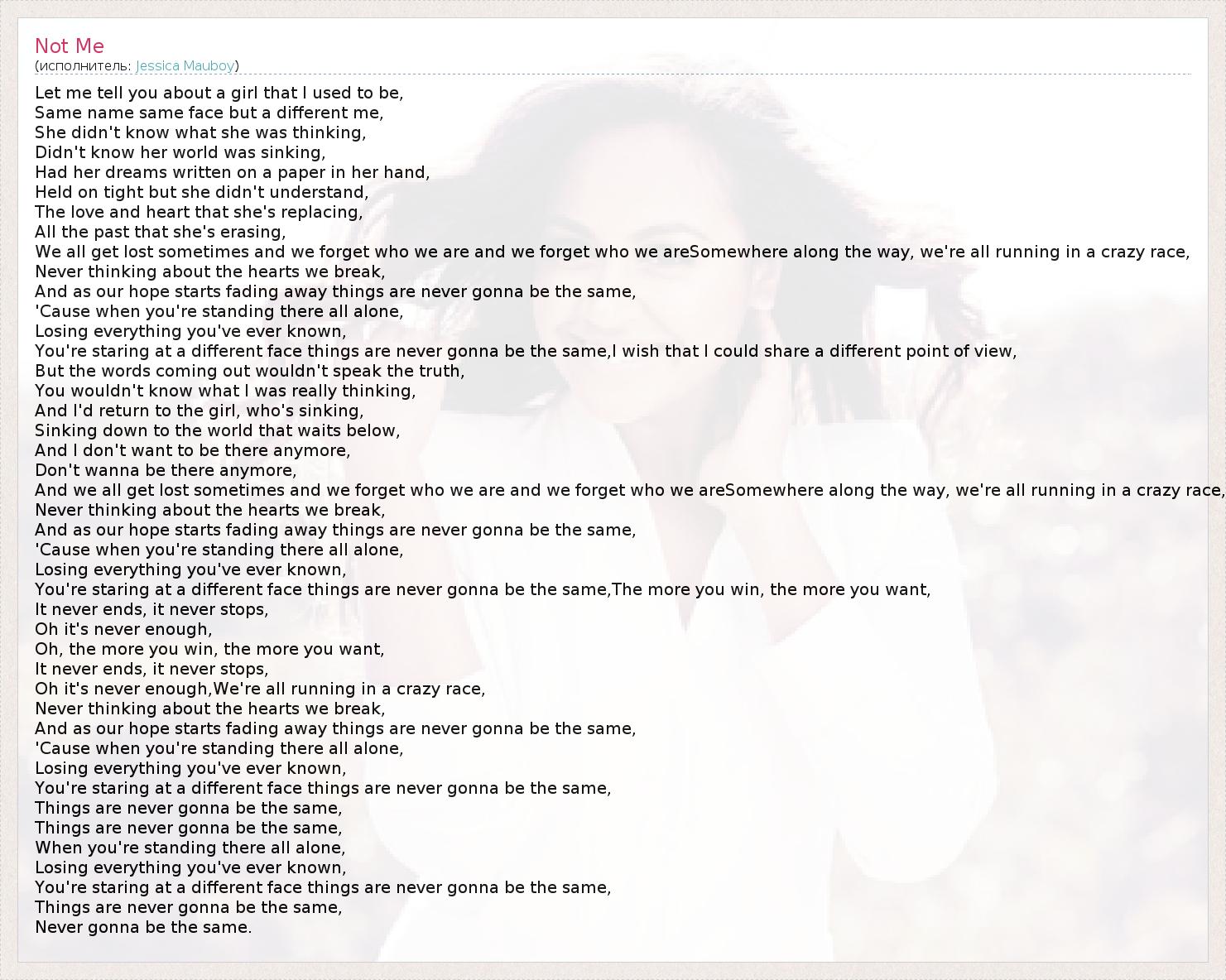 Let me tell you about a girl that I used to be, Same name same face but a different me, She didn't know what she was thinking, Didn't know her world was sinking, Had her dreams written on a paper in her hand, Held on tight but she didn't understand, The love and heart that she's replacing, All the past that she's erasing, We all get lost sometimes and we forget who we are and we forget who we areSomewhere along the way, we're all running in a crazy race, Never thinking about the hearts we break, And as our hope starts fading away things are never gonna be the same, 'Cause when you're standing there all alone, Losing everything you've ever known, You're staring at a different face things are never gonna be the same,I wish that I could share a different point of view, But the words coming out wouldn't speak the truth, You wouldn't know what I was really thinking, And I'd return to the girl, who's sinking, Sinking down to the world that waits below, And I don't want to be there anymore, Don't wanna be there anymore, And we all get lost sometimes and we forget who we are and we forget who we areSomewhere along the way, we're all running in a crazy race, Never thinking about the hearts we break, And as our hope starts fading away things are never gonna be the same, 'Cause when you're standing there all alone, Losing everything you've ever known, You're staring at a different face things are never gonna be the same,The more you win, the more you want, It never ends, it never stops, Oh it's never enough, Oh, the more you win, the more you want, It never ends, it never stops, Oh it's never enough,We're all running in a crazy race, Never thinking about the hearts we break, And as our hope starts fading away things are never gonna be the same, 'Cause when you're standing there all alone, Losing everything you've ever known, You're staring at a different face things are never gonna be the same, Things are never gonna be the same, Things are never gonna be the same, When you're standing there all alone, Losing everything you've ever known, You're staring at a different face things are never gonna be the same, Things are never gonna be the same, Never gonna be the same.