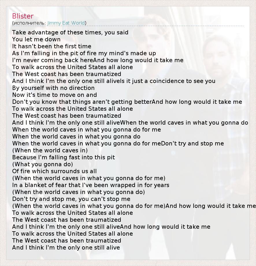 Это интересно:Группа была основана в городе Меса, штат Аризона в 1993 году. Вокалист и гитарист Джим Эдкинс и барабанщик Зак Линд, друзья еще с детского сада, объединили свои усилия с гитаристом Томом Линтоном и басистом Митчем Портером. Таким образом сформировался коллектив, получивший название Jimmy Eat World (Джимми Ест Мир). Первые годы группа подражала панк-рок стилю своих кумиров, записав Demo-кассету, семёрку... продолжение