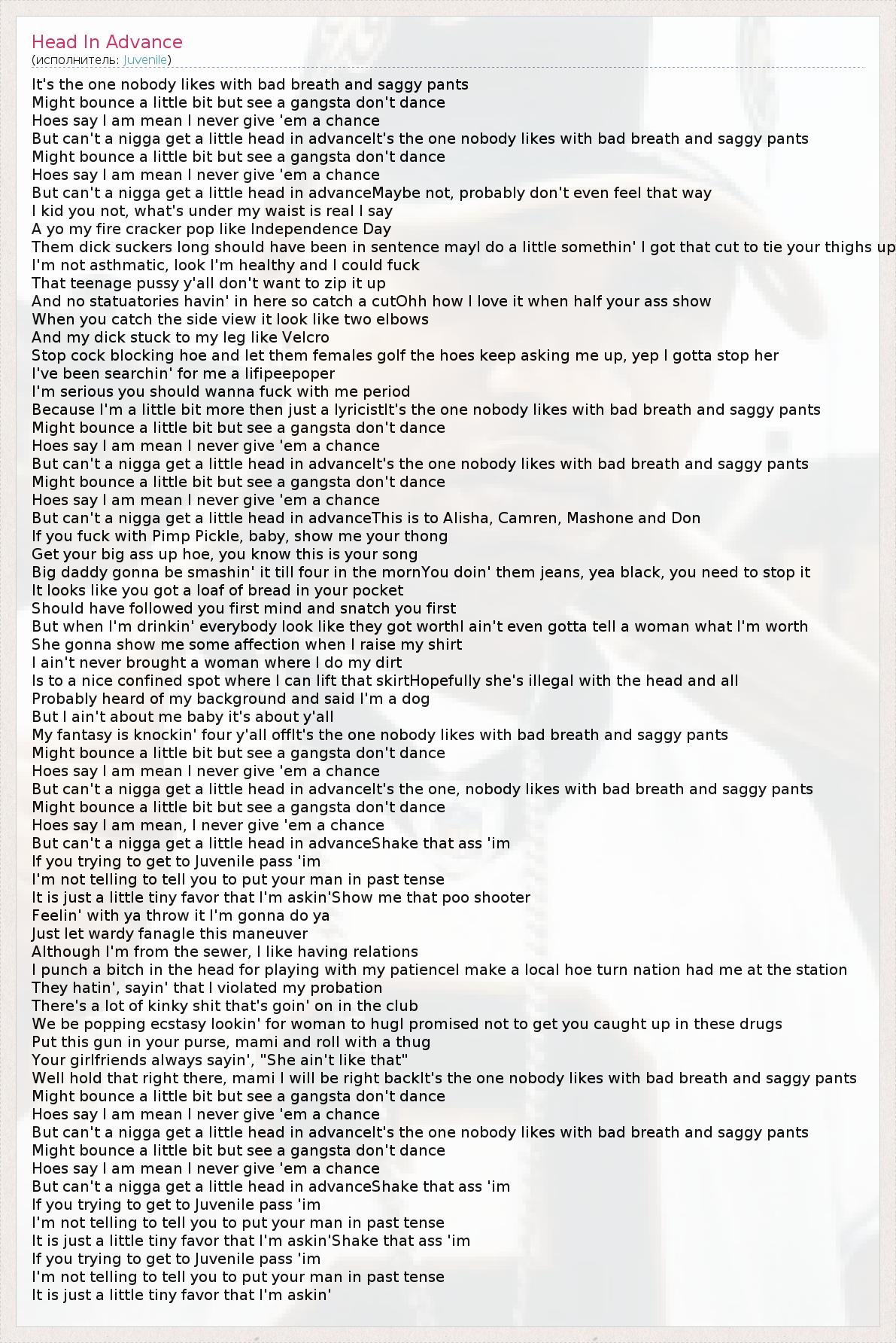 But can't a nigga get a little head in advanceIt's the one nobody likes with bad breath and saggy pants