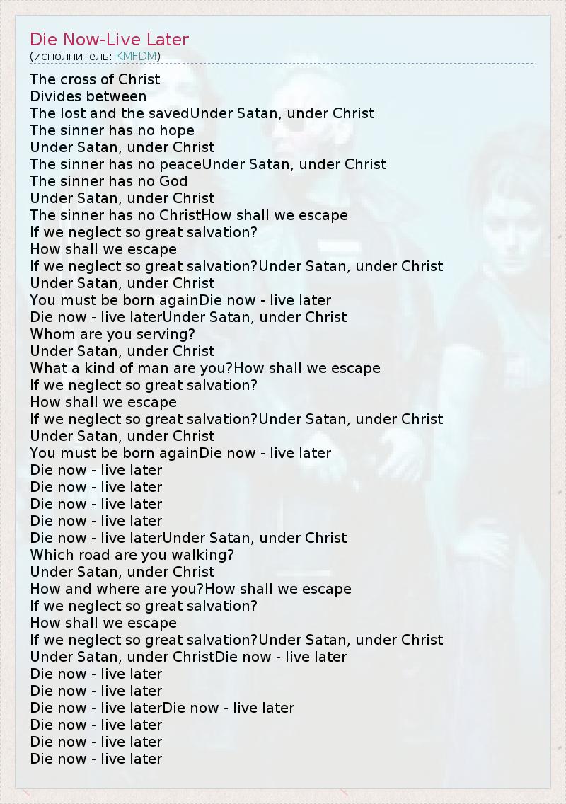 А как ты думаешь, о чем песня "Die Now-Live Later" ?