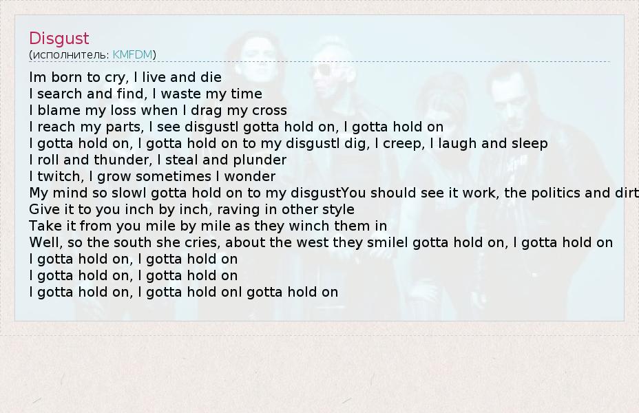 I gotta hold on, I gotta hold on to my disgustI dig, I creep, I laugh and sleep