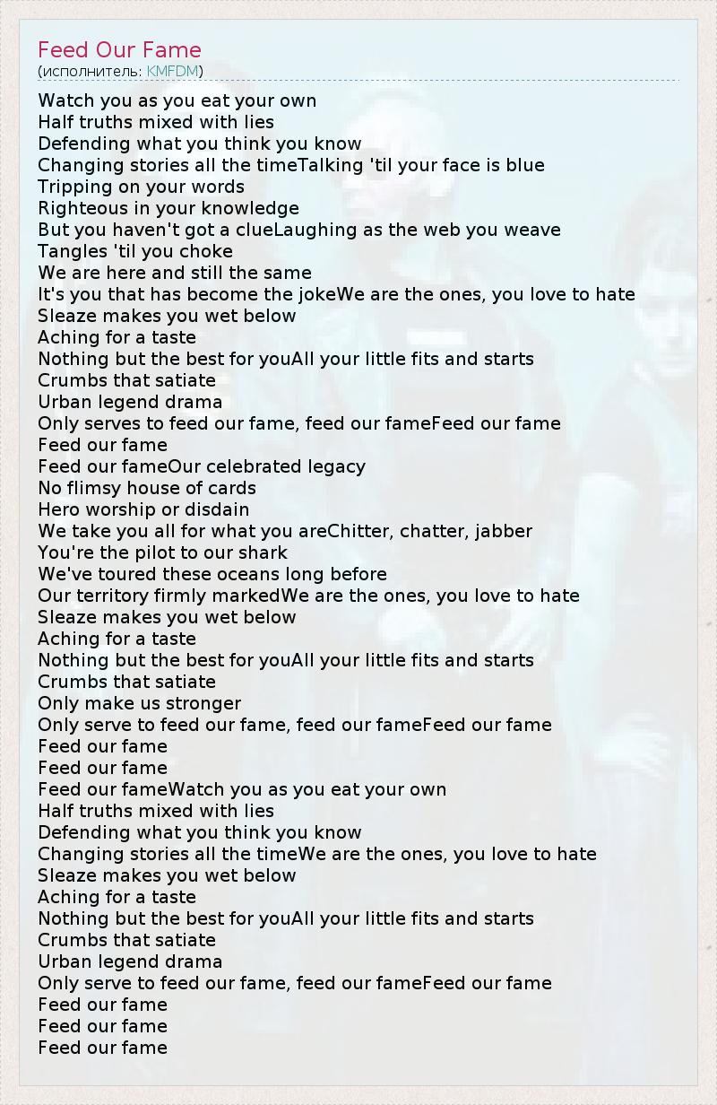 Watch you as you eat your own Half truths mixed with lies Defending what you think you know Changing stories all the timeTalking 'til your face is blue Tripping on your words Righteous in your knowledge But you haven't got a clueLaughing as the web you weave Tangles 'til you choke We are here and still the same It's you that has become the jokeWe are the ones, you love to hate Sleaze makes you wet below Aching for a taste Nothing but the best for youAll your little fits and starts Crumbs that satiate Urban legend drama Only serves to feed our fame, feed our fameFeed our fame Feed our fame Feed our fameOur celebrated legacy No flimsy house of cards Hero worship or disdain We take you all for what you areChitter, chatter, jabber You're the pilot to our shark We've toured these oceans long before Our territory firmly markedWe are the ones, you love to hate Sleaze makes you wet below Aching for a taste Nothing but the best for youAll your little fits and starts Crumbs that satiate Only make us stronger Only serve to feed our fame, feed our fameFeed our fame Feed our fame Feed our fame Feed our fameWatch you as you eat your own Half truths mixed with lies Defending what you think you know Changing stories all the timeWe are the ones, you love to hate Sleaze makes you wet below Aching for a taste Nothing but the best for youAll your little fits and starts Crumbs that satiate Urban legend drama Only serve to feed our fame, feed our fameFeed our fame Feed our fame Feed our fame Feed our fame