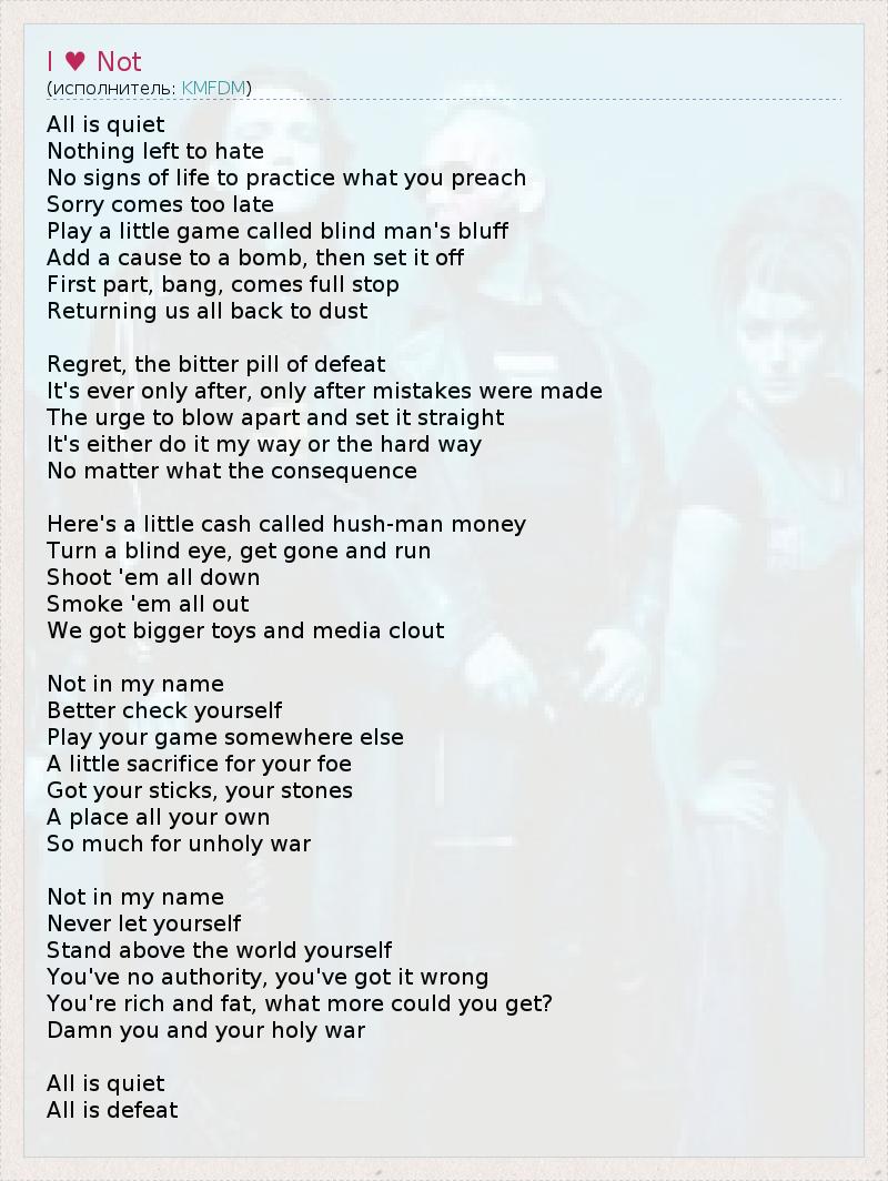 All is quiet Nothing left to hate No signs of life to practice what you preach Sorry comes too late Play a little game called blind man's bluff Add a cause to a bomb, then set it off First part, bang, comes full stop Returning us all back to dust Regret, the bitter pill of defeat It's ever only after, only after mistakes were made The urge to blow apart and set it straight It's either do it my way or the hard way No matter what the consequence Here's a little cash called hush-man money Turn a blind eye, get gone and run Shoot 'em all down Smoke 'em all out We got bigger toys and media clout Not in my name Better check yourself Play your game somewhere else A little sacrifice for your foe Got your sticks, your stones A place all your own So much for unholy war Not in my name Never let yourself Stand above the world yourself You've no authority, you've got it wrong You're rich and fat, what more could you get? Damn you and your holy war All is quiet All is defeat