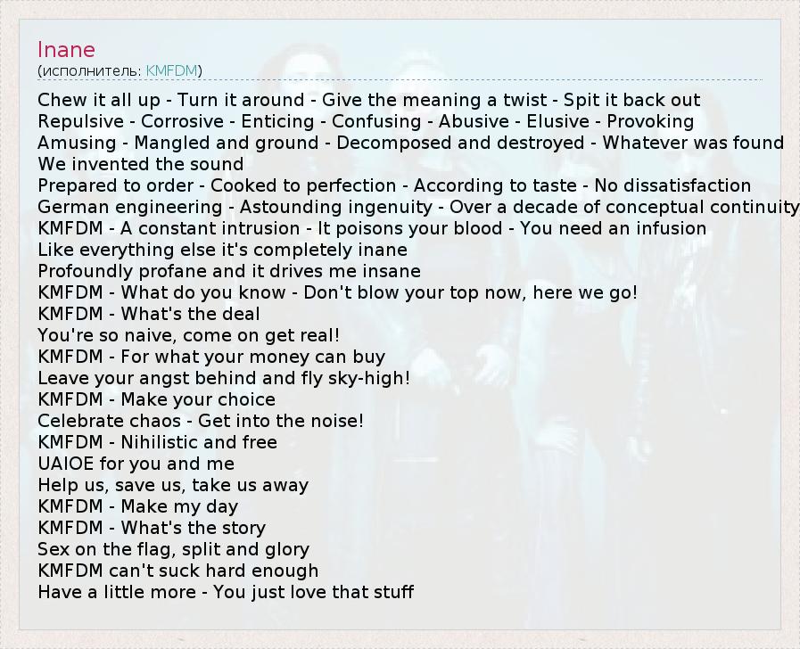 Это интересно:Группа KMFDM появилась в 1984 году в Гамбурге. Основателями группы являются Саша Конецко и Удо Штурм. В этом же году и появилось загадочная аббревиатура KMFDM. После того как Саша и Эн Эш покинули «Missing Foundations» они взяли к себе в команду англичанина Рэймонда Уоттса. Он же и придумал аббревиатуру KMFDM, так как для него название Kein Mitleid Für Die Mehrheit (Никакой Жалости к Большинству) было слишком сложным... продолжение