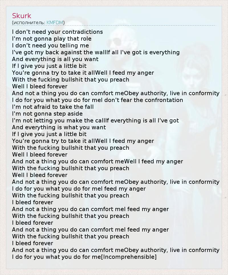 I don't need your contradictions I'm not gonna play that role I don't need you telling me I've got my back against the wallIf all I've got is everything And everything is all you want If I give you just a little bit You're gonna try to take it allWell I feed my anger With the fucking bullshit that you preach Well I bleed forever And not a thing you do can comfort meObey authority, live in conformity I do for you what you do for meI don't fear the confrontation I'm not afraid to take the fall I'm not gonna step aside I'm not letting you make the callIf everything is all I've got And everything is what you want If I give you just a little bit You're gonna try to take it allWell I feed my anger With the fucking bullshit that you preach Well I bleed forever And not a thing you do can comfort meWell I feed my anger With the fucking bullshit that you preach Well I bleed forever And not a thing you do can comfort meObey authority, live in conformity I do for you what you do for meI feed my anger With the fucking bullshit that you preach I bleed forever And not a thing you do can comfort meI feed my anger With the fucking bullshit that you preach I bleed forever And not a thing you do can comfort meI feed my anger With the fucking bullshit that you preach I bleed forever And not a thing you do can comfort meObey authority, live in conformity I do for you what you do for me[Incomprehensible]