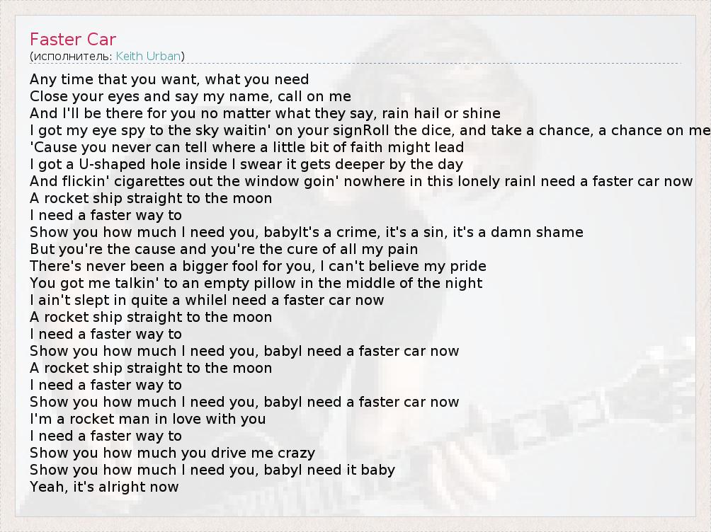 And flickin' cigarettes out the window goin' nowhere in this lonely rainI need a faster car now