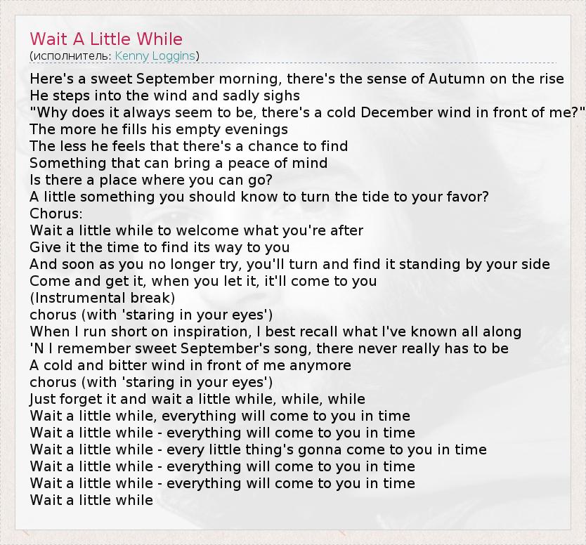 Here's a sweet September morning, there's the sense of Autumn on the rise He steps into the wind and sadly sighs "Why does it always seem to be, there's a cold December wind in front of me?" The more he fills his empty evenings The less he feels that there's a chance to find Something that can bring a peace of mind Is there a place where you can go? A little something you should know to turn the tide to your favor? Chorus: Wait a little while to welcome what you're after Give it the time to find its way to you And soon as you no longer try, you'll turn and find it standing by your side Come and get it, when you let it, it'll come to you (Instrumental break) chorus (with 'staring in your eyes') When I run short on inspiration, I best recall what I've known all along 'N I remember sweet September's song, there never really has to be A cold and bitter wind in front of me anymore chorus (with 'staring in your eyes') Just forget it and wait a little while, while, while Wait a little while, everything will come to you in time Wait a little while - everything will come to you in time Wait a little while - every little thing's gonna come to you in time Wait a little while - everything will come to you in time Wait a little while - everything will come to you in time Wait a little while