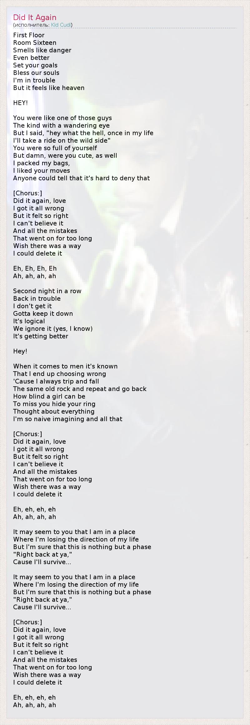 First Floor Room Sixteen Smells like danger Even better Set your goals Bless our souls I'm in trouble But it feels like heaven HEY! You were like one of those guys The kind with a wandering eye But I said, "hey what the hell, once in my life I'll take a ride on the wild side" You were so full of yourself But damn, were you cute, as well I packed my bags, I liked your moves Anyone could tell that it's hard to deny that [Chorus:] Did it again, love I got it all wrong But it felt so right I can't believe it And all the mistakes That went on for too long Wish there was a way I could delete it Eh, Eh, Eh, Eh Ah, ah, ah, ah Second night in a row Back in trouble I don't get it Gotta keep it down It's logical We ignore it (yes, I know) It's getting better Hey! When it comes to men it's known That I end up choosing wrong 'Cause I always trip and fall The same old rock and repeat and go back How blind a girl can be To miss you hide your ring Thought about everything I'm so naive imagining and all that [Chorus:] Did it again, love I got it all wrong But it felt so right I can't believe it And all the mistakes That went on for too long Wish there was a way I could delete it Eh, eh, eh, eh Ah, ah, ah, ah It may seem to you that I am in a place Where I'm losing the direction of my life But I'm sure that this is nothing but a phase "Right back at ya," Cause I'll survive... It may seem to you that I am in a place Where I'm losing the direction of my life But I'm sure that this is nothing but a phase "Right back at ya," Cause I'll survive... [Chorus:] Did it again, love I got it all wrong But it felt so right I can't believe it And all the mistakes That went on for too long Wish there was a way I could delete it Eh, eh, eh, eh Ah, ah, ah, ah