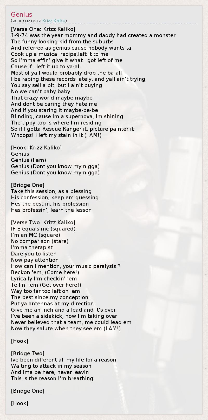 Это интересно:Samuel W.C. Watson, более известный под сценическим псевдонимом Krizz Kaliko (a.k.a Big Krizz Kaliko) - американский рэппер и певец родом из Канзас Сити, штат Миссури. Он уже долгое время сотрудничает со своим другом, неофициально носящим звание короля Канзаса, Tech N9ne, и также подписан на основанный Теком лейбл Strange Music, который, помимо Кали, собрал под своим крылом таких исполнителей как Kutt... продолжение
