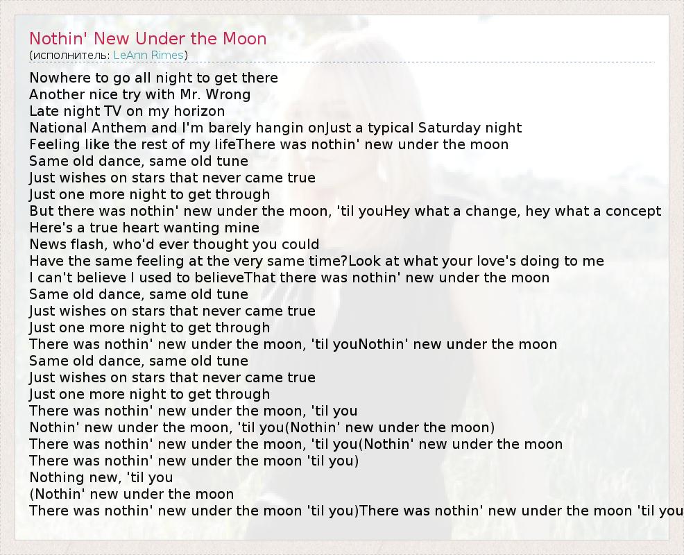 Nowhere to go all night to get there Another nice try with Mr. Wrong Late night TV on my horizon National Anthem and I'm barely hangin onJust a typical Saturday night Feeling like the rest of my lifeThere was nothin' new under the moon Same old dance, same old tune Just wishes on stars that never came true Just one more night to get through But there was nothin' new under the moon, 'til youHey what a change, hey what a concept Here's a true heart wanting mine News flash, who'd ever thought you could Have the same feeling at the very same time?Look at what your love's doing to me I can't believe I used to believeThat there was nothin' new under the moon Same old dance, same old tune Just wishes on stars that never came true Just one more night to get through There was nothin' new under the moon, 'til youNothin' new under the moon Same old dance, same old tune Just wishes on stars that never came true Just one more night to get through There was nothin' new under the moon, 'til you Nothin' new under the moon, 'til you(Nothin' new under the moon) There was nothin' new under the moon, 'til you(Nothin' new under the moon There was nothin' new under the moon 'til you) Nothing new, 'til you (Nothin' new under the moon There was nothin' new under the moon 'til you)There was nothin' new under the moon 'til you