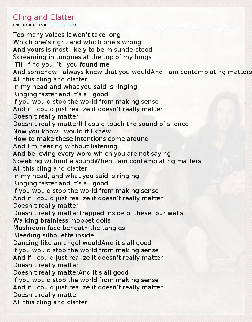 Too many voices it won't take long Which one's right and which one's wrong And yours is most likely to be misunderstood Screaming in tongues at the top of my lungs 'Til I find you, 'til you found me And somehow I always knew that you wouldAnd I am contemplating matters All this cling and clatter In my head and what you said is ringing Ringing faster and it's all good If you would stop the world from making sense And if I could just realize it doesn't really matter Doesn't really matter Doesn't really matterIf I could touch the sound of silence Now you know I would if I knew How to make these intentions come around And I'm hearing without listening And believing every word which you are not saying Speaking without a soundWhen I am contemplating matters All this cling and clatter In my head, and what you said is ringing Ringing faster and it's all good If you would stop the world from making sense And if I could just realize it doesn't really matter Doesn't really matter Doesn't really matterTrapped inside of these four walls Walking brainless moppet dolls Mushroom face beneath the tangles Bleeding silhouette inside Dancing like an angel wouldAnd it's all good If you would stop the world from making sense And if I could just realize it doesn't really matter Doesn't really matter Doesn't really matterAnd it's all good If you would stop the world from making sense And if I could just realize it doesn't really matter Doesn't really matter All this cling and clatter