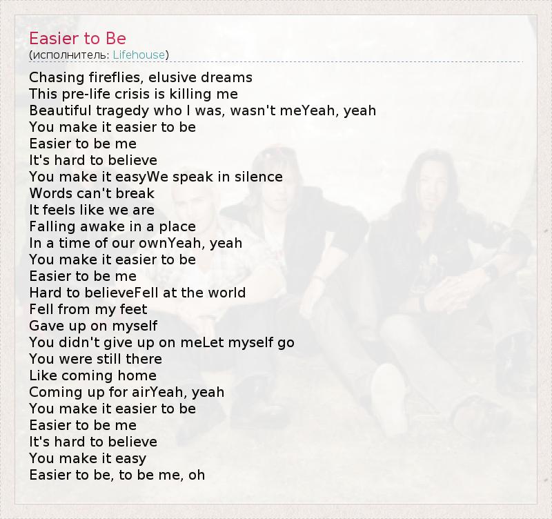 Chasing fireflies, elusive dreams This pre-life crisis is killing me Beautiful tragedy who I was, wasn't meYeah, yeah You make it easier to be Easier to be me It's hard to believe You make it easyWe speak in silence Words can't break It feels like we are Falling awake in a place In a time of our ownYeah, yeah You make it easier to be Easier to be me Hard to believeFell at the world Fell from my feet Gave up on myself You didn't give up on meLet myself go You were still there Like coming home Coming up for airYeah, yeah You make it easier to be Easier to be me It's hard to believe You make it easy Easier to be, to be me, oh