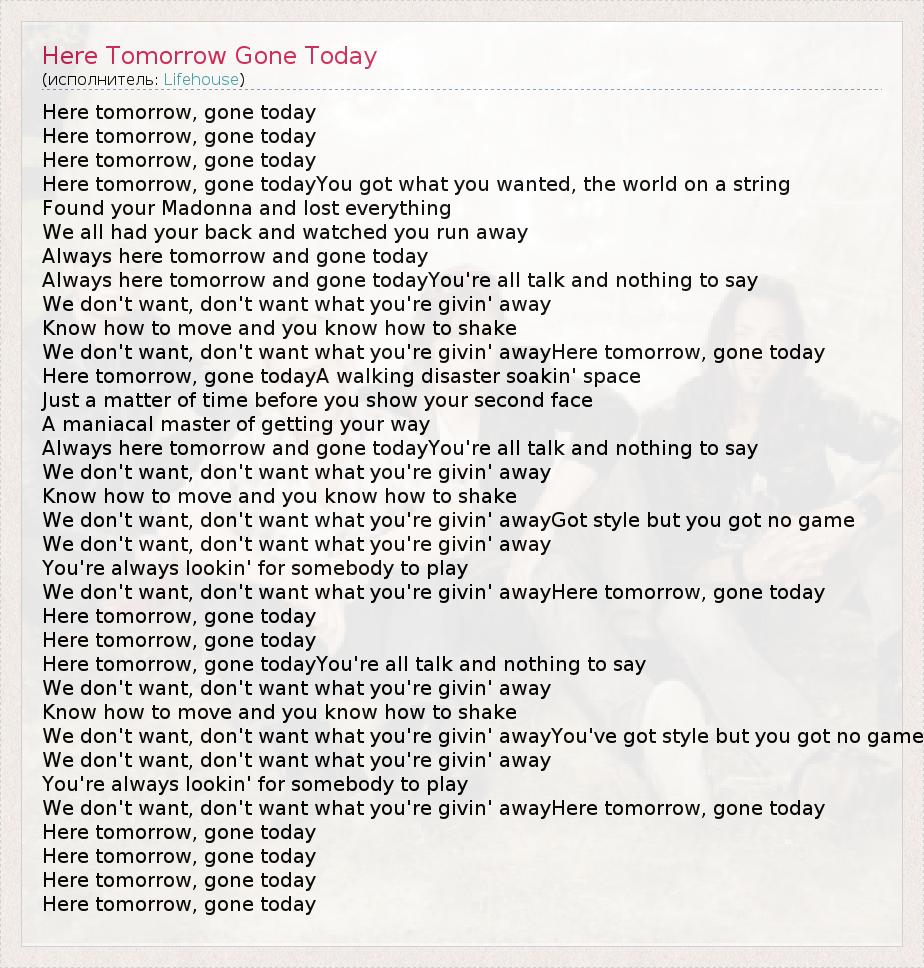 Here tomorrow, gone today Here tomorrow, gone today Here tomorrow, gone today Here tomorrow, gone todayYou got what you wanted, the world on a string Found your Madonna and lost everything We all had your back and watched you run away Always here tomorrow and gone today Always here tomorrow and gone todayYou're all talk and nothing to say We don't want, don't want what you're givin' away Know how to move and you know how to shake We don't want, don't want what you're givin' awayHere tomorrow, gone today Here tomorrow, gone todayA walking disaster soakin' space Just a matter of time before you show your second face A maniacal master of getting your way Always here tomorrow and gone todayYou're all talk and nothing to say We don't want, don't want what you're givin' away Know how to move and you know how to shake We don't want, don't want what you're givin' awayGot style but you got no game We don't want, don't want what you're givin' away You're always lookin' for somebody to play We don't want, don't want what you're givin' awayHere tomorrow, gone today Here tomorrow, gone today Here tomorrow, gone today Here tomorrow, gone todayYou're all talk and nothing to say We don't want, don't want what you're givin' away Know how to move and you know how to shake We don't want, don't want what you're givin' awayYou've got style but you got no game We don't want, don't want what you're givin' away You're always lookin' for somebody to play We don't want, don't want what you're givin' awayHere tomorrow, gone today Here tomorrow, gone today Here tomorrow, gone today Here tomorrow, gone today Here tomorrow, gone today