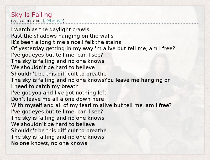 I watch as the daylight crawls Past the shadows hanging on the walls It's been a long time since I felt the stains Of yesterday getting in my wayI'm alive but tell me, am I free? I've got eyes but tell me, can I see? The sky is falling and no one knows We shouldn't be hard to believe Shouldn't be this difficult to breathe The sky is falling and no one knowsYou leave me hanging on I need to catch my breath I've got you and I've got nothing left Don't leave me all alone down here With myself and all of my fearI'm alive but tell me, am I free? I've got eyes but tell me, can I see? The sky is falling and no one knows We shouldn't be hard to believe Shouldn't be this difficult to breathe The sky is falling and no one knows No one knows, no one knows
