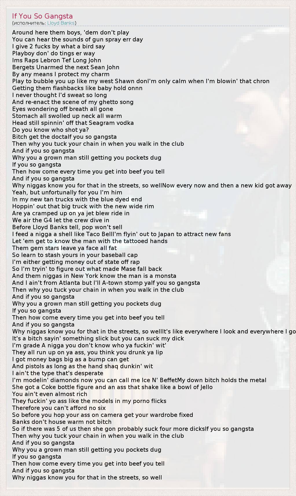 Around here them boys, 'dem don't play You can hear the sounds of gun spray err day I give 2 fucks by what a bird say Playboy don' do tings er way Ims Raps Lebron Tef Long John Bergets Unarmed the next Sean John By any means I protect my charm Play to bubble you up like my west Shawn donI'm only calm when I'm blowin' that chron Getting them flashbacks like baby hold onnn I never thought I'd sweat so long And re-enact the scene of my ghetto song Eyes wondering off breath all gone Stomach all swolled up neck all warm Head still spinnin' off that Seagram vodka Do you know who shot ya? Bitch get the doctaIf you so gangsta Then why you tuck your chain in when you walk in the club And if you so gangsta Why you a grown man still getting you pockets dug If you so gangsta Then how come every time you get into beef you tell And if you so gangsta Why niggas know you for that in the streets, so wellNow every now and then a new kid got away Yeah, but unfortunally for you I'm him In my new tan trucks with the blue dyed end Hoppin' out that big truck with the new wide rim Are ya cramped up on ya jet blew ride in We air the G4 let the crew dive in Before Lloyd Banks tell, pop won't sell I feed a nigga a shell like Taco BellI'm flyin' out to Japan to attract new fans Let 'em get to know the man with the tattooed hands Them gem stars leave ya face all fat So learn to stash yours in your baseball cap I'm either getting money out of state off rap So I'm tryin' to figure out what made Mase fall back And them niggas in New York know the man is a monsta And I ain't from Atlanta but I'll A-town stomp yaIf you so gangsta Then why you tuck your chain in when you walk in the club And if you so gangsta Why you a grown man still getting you pockets dug If you so gangsta Then how come every time you get into beef you tell And if you so gangsta Why niggas know you for that in the streets, so wellIt's like everywhere I look and everywhere I go It's a bitch sayin' something slick but you can suck my dick I'm grade A nigga you don't know who ya fuckin' wit' They all run up on ya ass, you think you drunk ya lip I got money bags big as a bump can get And pistols as long as the hand shaq dunkin' wit I ain't the type that's desperate I'm modelin' diamonds now you can call me Ice N' BeffetMy down bitch holds the metal She got a Coke bottle figure and an ass that shake like a bowl of Jello You ain't even almost rich They fuckin' yo ass like the models in my porno flicks Therefore you can't afford no six So before you hop your ass on camera get your wardrobe fixed Banks don't house warm not bitch So if there was 5 of us then she gon probably suck four more dicksIf you so gangsta Then why you tuck your chain in when you walk in the club And if you so gangsta Why you a grown man still getting you pockets dug If you so gangsta Then how come every time you get into beef you tell And if you so gangsta Why niggas know you for that in the streets, so well