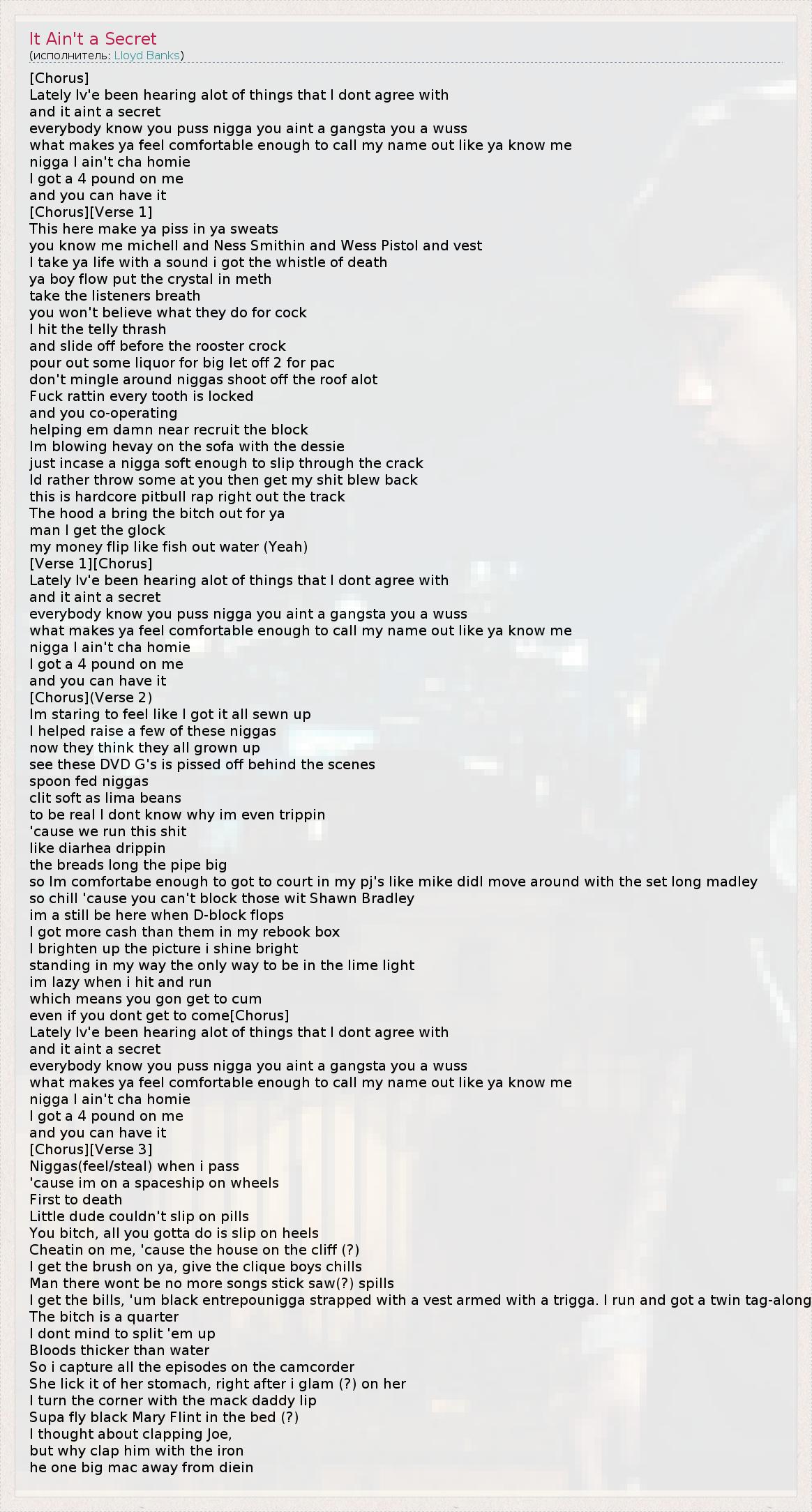 [Chorus] Lately Iv'e been hearing alot of things that I dont agree with and it aint a secret everybody know you puss nigga you aint a gangsta you a wuss what makes ya feel comfortable enough to call my name out like ya know me nigga I ain't cha homie I got a 4 pound on me and you can have it [Chorus][Verse 1] This here make ya piss in ya sweats you know me michell and Ness Smithin and Wess Pistol and vest I take ya life with a sound i got the whistle of death ya boy flow put the crystal in meth take the listeners breath you won't believe what they do for cock I hit the telly thrash and slide off before the rooster crock pour out some liquor for big let off 2 for pac don't mingle around niggas shoot off the roof alot Fuck rattin every tooth is locked and you co-operating helping em damn near recruit the block Im blowing hevay on the sofa with the dessie just incase a nigga soft enough to slip through the crack Id rather throw some at you then get my shit blew back this is hardcore pitbull rap right out the track The hood a bring the bitch out for ya man I get the glock my money flip like fish out water (Yeah) [Verse 1][Chorus] Lately Iv'e been hearing alot of things that I dont agree with and it aint a secret everybody know you puss nigga you aint a gangsta you a wuss what makes ya feel comfortable enough to call my name out like ya know me nigga I ain't cha homie I got a 4 pound on me and you can have it [Chorus](Verse 2) Im staring to feel like I got it all sewn up I helped raise a few of these niggas now they think they all grown up see these DVD G's is pissed off behind the scenes spoon fed niggas clit soft as lima beans to be real I dont know why im even trippin 'cause we run this shit like diarhea drippin the breads long the pipe big so Im comfortabe enough to got to court in my pj's like mike didI move around with the set long madley so chill 'cause you can't block those wit Shawn Bradley im a still be here when D-block flops I got more cash than them in my rebook box I brighten up the picture i shine bright standing in my way the only way to be in the lime light im lazy when i hit and run which means you gon get to cum even if you dont get to come[Chorus] Lately Iv'e been hearing alot of things that I dont agree with and it aint a secret everybody know you puss nigga you aint a gangsta you a wuss what makes ya feel comfortable enough to call my name out like ya know me nigga I ain't cha homie I got a 4 pound on me and you can have it [Chorus][Verse 3] Niggas(feel/steal) when i pass 'cause im on a spaceship on wheels First to death Little dude couldn't slip on pills You bitch, all you gotta do is slip on heels Cheatin on me, 'cause the house on the cliff (?) I get the brush on ya, give the clique boys chills Man there wont be no more songs stick saw(?) spills I get the bills, 'um black entrepounigga strapped with a vest armed with a trigga. I run and got a twin tag-along The bitch is a quarter I dont mind to split 'em up Bloods thicker than water So i capture all the episodes on the camcorder She lick it of her stomach, right after i glam (?) on her I turn the corner with the mack daddy lip Supa fly black Mary Flint in the bed (?) I thought about clapping Joe, but why clap him with the iron he one big mac away from diein
