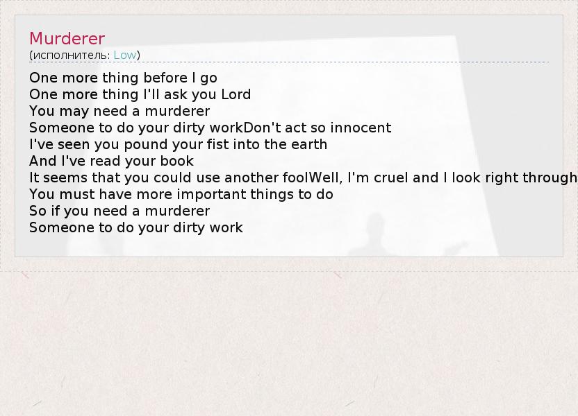 One more thing before I go One more thing I'll ask you Lord You may need a murderer Someone to do your dirty workDon't act so innocent I've seen you pound your fist into the earth And I've read your book It seems that you could use another foolWell, I'm cruel and I look right through You must have more important things to do So if you need a murderer Someone to do your dirty work