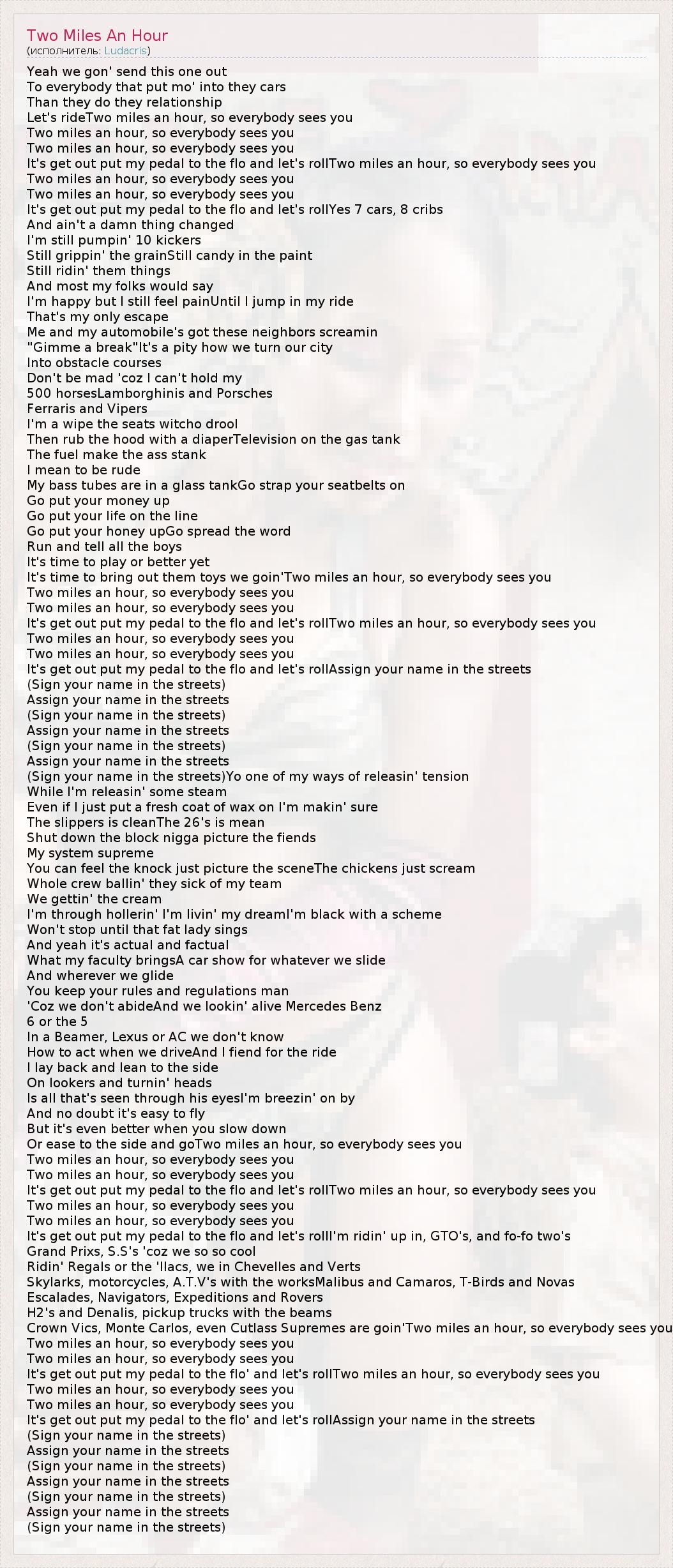Yeah we gon' send this one out To everybody that put mo' into they cars Than they do they relationship Let's rideTwo miles an hour, so everybody sees you Two miles an hour, so everybody sees you Two miles an hour, so everybody sees you It's get out put my pedal to the flo and let's rollTwo miles an hour, so everybody sees you Two miles an hour, so everybody sees you Two miles an hour, so everybody sees you It's get out put my pedal to the flo and let's rollYes 7 cars, 8 cribs And ain't a damn thing changed I'm still pumpin' 10 kickers Still grippin' the grainStill candy in the paint Still ridin' them things And most my folks would say I'm happy but I still feel painUntil I jump in my ride That's my only escape Me and my automobile's got these neighbors screamin "Gimme a break"It's a pity how we turn our city Into obstacle courses Don't be mad 'coz I can't hold my 500 horsesLamborghinis and Porsches Ferraris and Vipers I'm a wipe the seats witcho drool Then rub the hood with a diaperTelevision on the gas tank The fuel make the ass stank I mean to be rude My bass tubes are in a glass tankGo strap your seatbelts on Go put your money up Go put your life on the line Go put your honey upGo spread the word Run and tell all the boys It's time to play or better yet It's time to bring out them toys we goin'Two miles an hour, so everybody sees you Two miles an hour, so everybody sees you Two miles an hour, so everybody sees you It's get out put my pedal to the flo and let's rollTwo miles an hour, so everybody sees you Two miles an hour, so everybody sees you Two miles an hour, so everybody sees you It's get out put my pedal to the flo and let's rollAssign your name in the streets (Sign your name in the streets) Assign your name in the streets (Sign your name in the streets) Assign your name in the streets (Sign your name in the streets) Assign your name in the streets (Sign your name in the streets)Yo one of my ways of releasin' tension While I'm releasin' some steam Even if I just put a fresh coat of wax on I'm makin' sure The slippers is cleanThe 26's is mean Shut down the block nigga picture the fiends My system supreme You can feel the knock just picture the sceneThe chickens just scream Whole crew ballin' they sick of my team We gettin' the cream I'm through hollerin' I'm livin' my dreamI'm black with a scheme Won't stop until that fat lady sings And yeah it's actual and factual What my faculty bringsA car show for whatever we slide And wherever we glide You keep your rules and regulations man 'Coz we don't abideAnd we lookin' alive Mercedes Benz 6 or the 5 In a Beamer, Lexus or AC we don't know How to act when we driveAnd I fiend for the ride I lay back and lean to the side On lookers and turnin' heads Is all that's seen through his eyesI'm breezin' on by And no doubt it's easy to fly But it's even better when you slow down Or ease to the side and goTwo miles an hour, so everybody sees you Two miles an hour, so everybody sees you Two miles an hour, so everybody sees you It's get out put my pedal to the flo and let's rollTwo miles an hour, so everybody sees you Two miles an hour, so everybody sees you Two miles an hour, so everybody sees you It's get out put my pedal to the flo and let's rollI'm ridin' up in, GTO's, and fo-fo two's Grand Prixs, S.S's 'coz we so so cool Ridin' Regals or the 'llacs, we in Chevelles and Verts Skylarks, motorcycles, A.T.V's with the worksMalibus and Camaros, T-Birds and Novas Escalades, Navigators, Expeditions and Rovers H2's and Denalis, pickup trucks with the beams Crown Vics, Monte Carlos, even Cutlass Supremes are goin'Two miles an hour, so everybody sees you Two miles an hour, so everybody sees you Two miles an hour, so everybody sees you It's get out put my pedal to the flo' and let's rollTwo miles an hour, so everybody sees you Two miles an hour, so everybody sees you Two miles an hour, so everybody sees you It's get out put my pedal to the flo' and let's rollAssign your name in the streets (Sign your name in the streets) Assign your name in the streets (Sign your name in the streets) Assign your name in the streets (Sign your name in the streets) Assign your name in the streets (Sign your name in the streets)