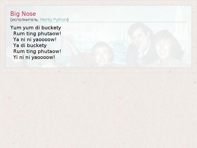 Это интересно:Монти Пайтон (англ. Monty Python) — комик-группа из Великобритании, состоявшая из шести человек. Благодаря своему инновационному, абсурдистскому юмору участники «Монти Пайтон» («Пайтоны») находятся в числе самых влиятельных комиков всех времён. Труппа известна во многом благодаря юмористическому телешоу «Летающий цирк Монти Пайтона», выходившему на BBC в 1969—1974 годах; также она выпустила... продолжение