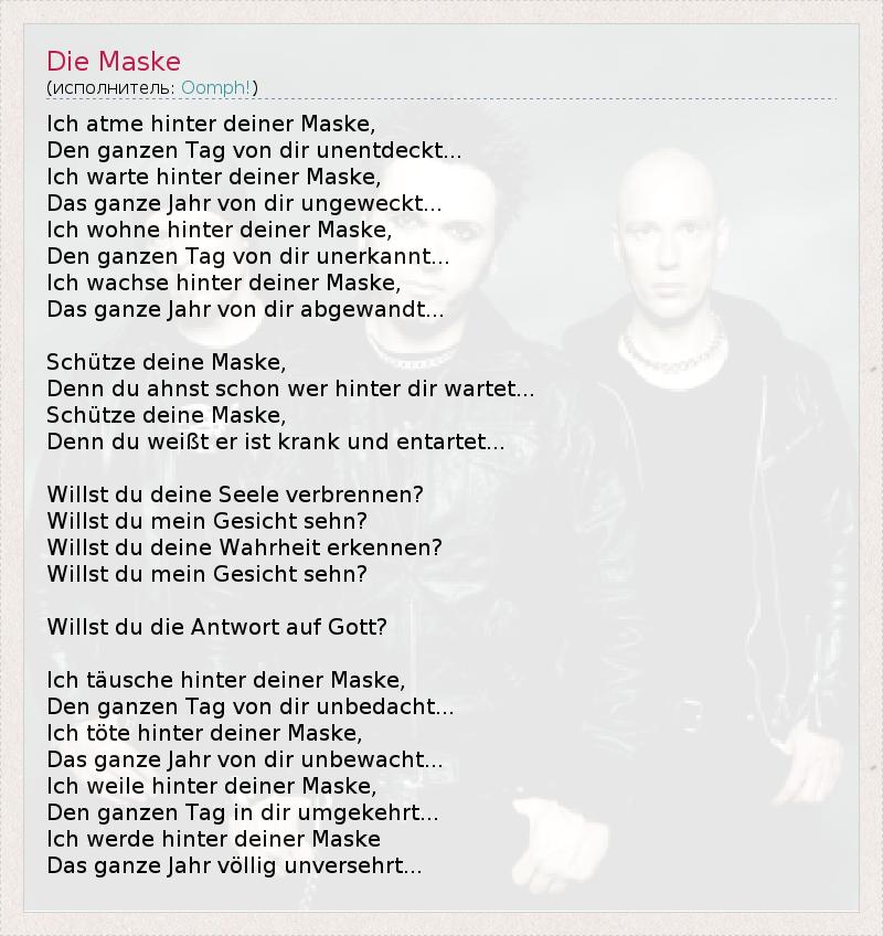 Это интересно:Постоянное движение вперед, полная самоотдача и великолепное звучание — всё это свойственно Oomph!. В течение 25-ти лет музыкальные произведения этого трио из Нижней Саксонии были сформированы их духом первооткрывательства. Критики, фэны и коллеги единодушно говорят, что эти три парня занимают место среди «самых революционных фигур немецкой музыкальной сцены». Rammstein... продолжение