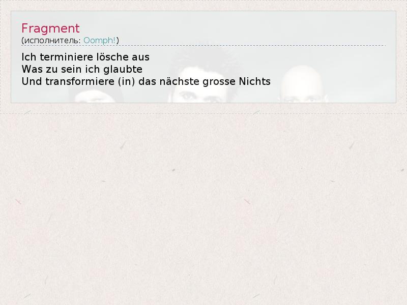 Это интересно:Постоянное движение вперед, полная самоотдача и великолепное звучание — всё это свойственно Oomph!. В течение 25-ти лет музыкальные произведения этого трио из Нижней Саксонии были сформированы их духом первооткрывательства. Критики, фэны и коллеги единодушно говорят, что эти три парня занимают место среди «самых революционных фигур немецкой музыкальной сцены». Rammstein... продолжение
