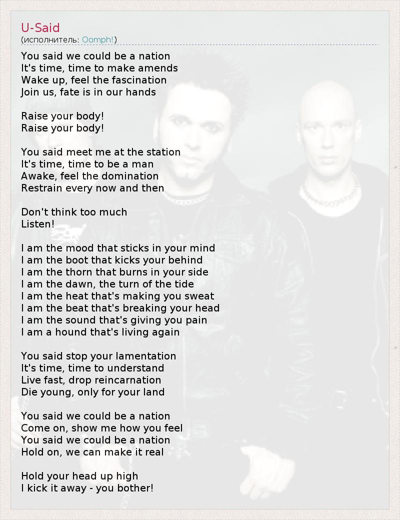 Это интересно:Постоянное движение вперед, полная самоотдача и великолепное звучание — всё это свойственно Oomph!. В течение 25-ти лет музыкальные произведения этого трио из Нижней Саксонии были сформированы их духом первооткрывательства. Критики, фэны и коллеги единодушно говорят, что эти три парня занимают место среди «самых революционных фигур немецкой музыкальной сцены». Rammstein... продолжение