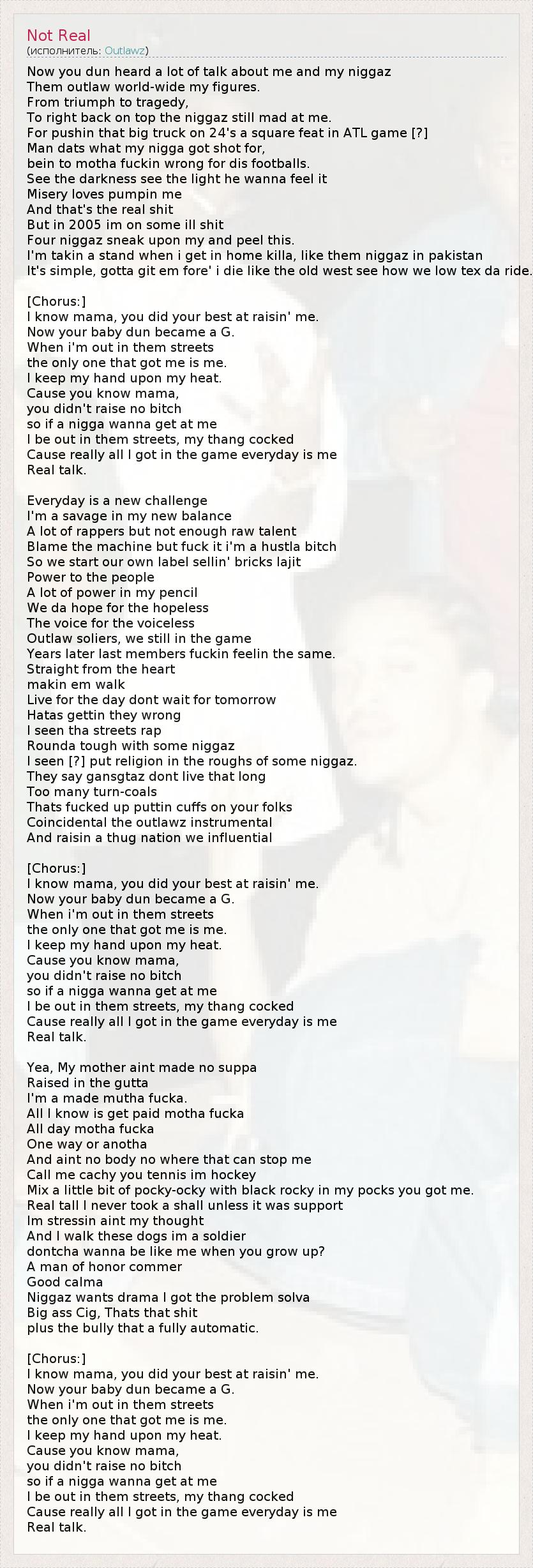 Now you dun heard a lot of talk about me and my niggaz Them outlaw world-wide my figures. From triumph to tragedy, To right back on top the niggaz still mad at me. For pushin that big truck on 24's a square feat in ATL game [?] Man dats what my nigga got shot for, bein to motha fuckin wrong for dis footballs. See the darkness see the light he wanna feel it Misery loves pumpin me And that's the real shit But in 2005 im on some ill shit Four niggaz sneak upon my and peel this. I'm takin a stand when i get in home killa, like them niggaz in pakistan It's simple, gotta git em fore' i die like the old west see how we low tex da ride. [Chorus:] I know mama, you did your best at raisin' me. Now your baby dun became a G. When i'm out in them streets the only one that got me is me. I keep my hand upon my heat. Cause you know mama, you didn't raise no bitch so if a nigga wanna get at me I be out in them streets, my thang cocked Cause really all I got in the game everyday is me Real talk. Everyday is a new challenge I'm a savage in my new balance A lot of rappers but not enough raw talent Blame the machine but fuck it i'm a hustla bitch So we start our own label sellin' bricks lajit Power to the people A lot of power in my pencil We da hope for the hopeless The voice for the voiceless Outlaw soliers, we still in the game Years later last members fuckin feelin the same. Straight from the heart makin em walk Live for the day dont wait for tomorrow Hatas gettin they wrong I seen tha streets rap Rounda tough with some niggaz I seen [?] put religion in the roughs of some niggaz. They say gansgtaz dont live that long Too many turn-coals Thats fucked up puttin cuffs on your folks Coincidental the outlawz instrumental And raisin a thug nation we influential [Chorus:] I know mama, you did your best at raisin' me. Now your baby dun became a G. When i'm out in them streets the only one that got me is me. I keep my hand upon my heat. Cause you know mama, you didn't raise no bitch so if a nigga wanna get at me I be out in them streets, my thang cocked Cause really all I got in the game everyday is me Real talk. Yea, My mother aint made no suppa Raised in the gutta I'm a made mutha fucka. All I know is get paid motha fucka All day motha fucka One way or anotha And aint no body no where that can stop me Call me cachy you tennis im hockey Mix a little bit of pocky-ocky with black rocky in my pocks you got me. Real tall I never took a shall unless it was support Im stressin aint my thought And I walk these dogs im a soldier dontcha wanna be like me when you grow up? A man of honor commer Good calma Niggaz wants drama I got the problem solva Big ass Cig, Thats that shit plus the bully that a fully automatic. [Chorus:] I know mama, you did your best at raisin' me. Now your baby dun became a G. When i'm out in them streets the only one that got me is me. I keep my hand upon my heat. Cause you know mama, you didn't raise no bitch so if a nigga wanna get at me I be out in them streets, my thang cocked Cause really all I got in the game everyday is me Real talk.