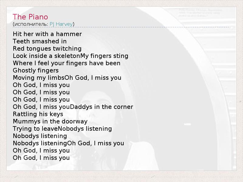 Hit her with a hammer Teeth smashed in Red tongues twitching Look inside a skeletonMy fingers sting Where I feel your fingers have been Ghostly fingers Moving my limbsOh God, I miss you Oh God, I miss you Oh God, I miss you Oh God, I miss you Oh God, I miss youDaddys in the corner Rattling his keys Mummys in the doorway Trying to leaveNobodys listening Nobodys listening Nobodys listeningOh God, I miss you Oh God, I miss you Oh God, I miss you