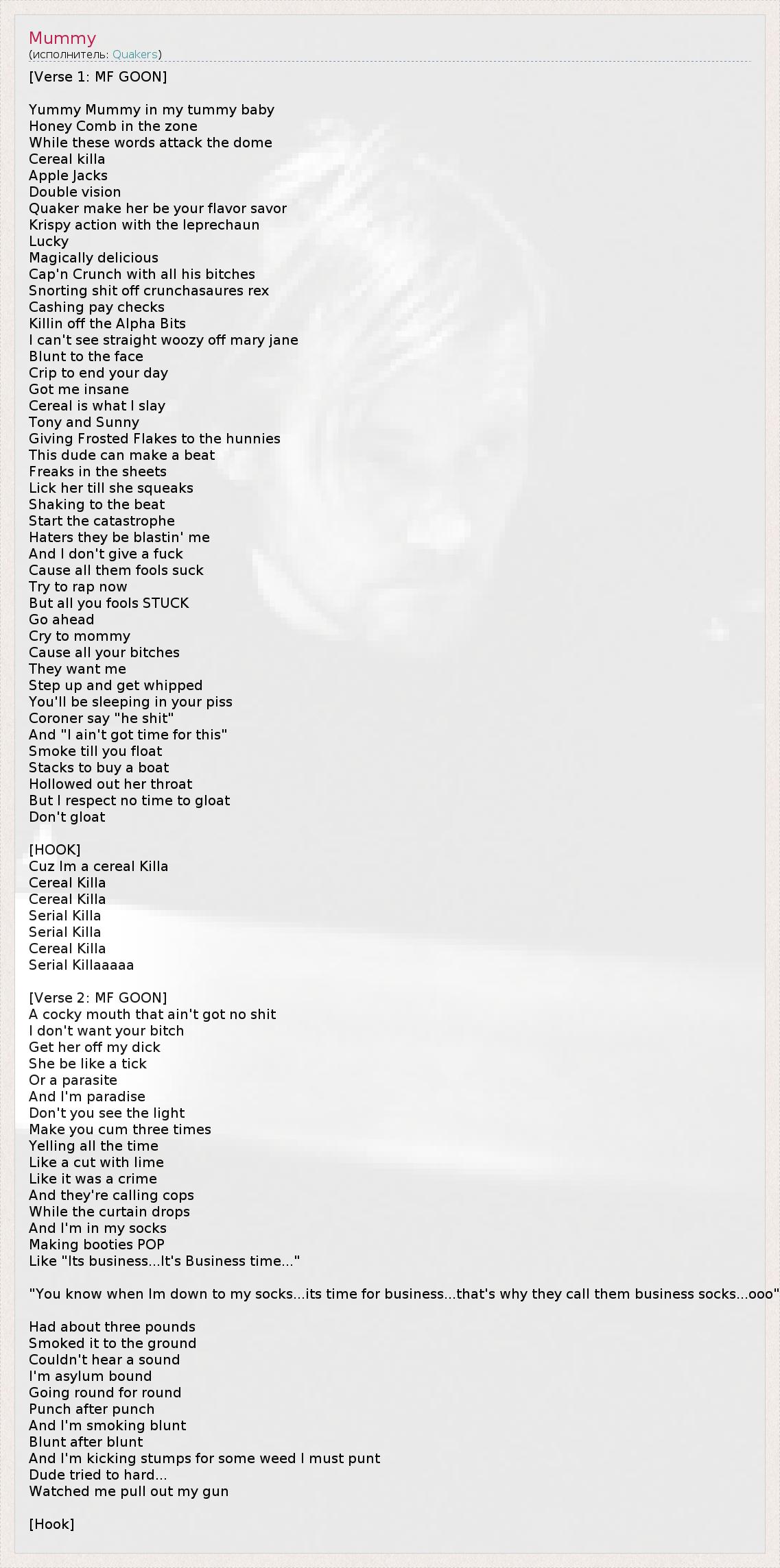 [Verse 1: MF GOON] Yummy Mummy in my tummy baby Honey Comb in the zone While these words attack the dome Cereal killa Apple Jacks Double vision Quaker make her be your flavor savor Krispy action with the leprechaun Lucky Magically delicious Cap'n Crunch with all his bitches Snorting shit off crunchasaures rex Cashing pay checks Killin off the Alpha Bits I can't see straight woozy off mary jane Blunt to the face Crip to end your day Got me insane Cereal is what I slay Tony and Sunny Giving Frosted Flakes to the hunnies This dude can make a beat Freaks in the sheets Lick her till she squeaks Shaking to the beat Start the catastrophe Haters they be blastin' me And I don't give a fuck Cause all them fools suck Try to rap now But all you fools STUCK Go ahead Cry to mommy Cause all your bitches They want me Step up and get whipped You'll be sleeping in your piss Coroner say "he shit" And "I ain't got time for this" Smoke till you float Stacks to buy a boat Hollowed out her throat But I respect no time to gloat Don't gloat [HOOK] Cuz Im a cereal Killa Cereal Killa Cereal Killa Serial Killa Serial Killa Cereal Killa Serial Killaaaaa [Verse 2: MF GOON] A cocky mouth that ain't got no shit I don't want your bitch Get her off my dick She be like a tick Or a parasite And I'm paradise Don't you see the light Make you cum three times Yelling all the time Like a cut with lime Like it was a crime And they're calling cops While the curtain drops And I'm in my socks Making booties POP Like "Its business...It's Business time..." "You know when Im down to my socks...its time for business...that's why they call them business socks...ooo" Had about three pounds Smoked it to the ground Couldn't hear a sound I'm asylum bound Going round for round Punch after punch And I'm smoking blunt Blunt after blunt And I'm kicking stumps for some weed I must punt Dude tried to hard... Watched me pull out my gun [Hook]
