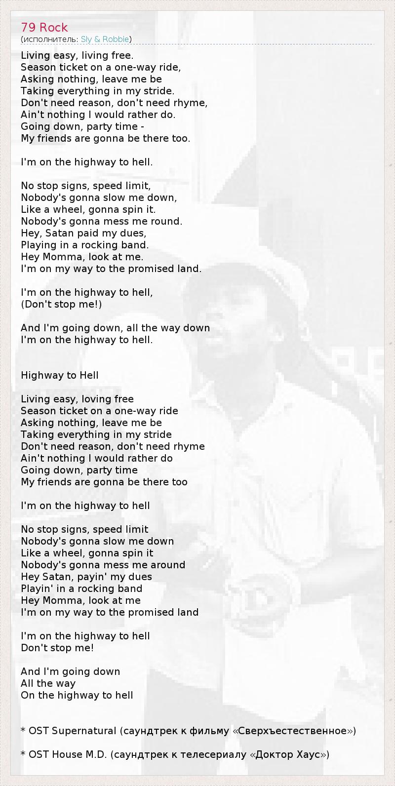 Living easy, living free. Season ticket on a one-way ride, Asking nothing, leave me be Taking everything in my stride. Don't need reason, don't need rhyme, Ain't nothing I would rather do. Going down, party time - My friends are gonna be there too. I'm on the highway to hell. No stop signs, speed limit, Nobody's gonna slow me down, Like a wheel, gonna spin it. Nobody's gonna mess me round. Hey, Satan paid my dues, Playing in a rocking band. Hey Momma, look at me. I'm on my way to the promised land. I'm on the highway to hell, (Don't stop me!) And I'm going down, all the way down I'm on the highway to hell. Highway to Hell Living easy, loving free Season ticket on a one-way ride Asking nothing, leave me be Taking everything in my stride Don't need reason, don't need rhyme Ain't nothing I would rather do Going down, party time My friends are gonna be there too I'm on the highway to hell No stop signs, speed limit Nobody's gonna slow me down Like a wheel, gonna spin it Nobody's gonna mess me around Hey Satan, payin' my dues Playin' in a rocking band Hey Momma, look at me I'm on my way to the promised land I'm on the highway to hell Don't stop me! And I'm going down All the way On the highway to hell * OST Supernatural (саундтрек к фильму «Сверхъестественное») * OST House M.D. (саундтрек к телесериалу «Доктор Хаус»)