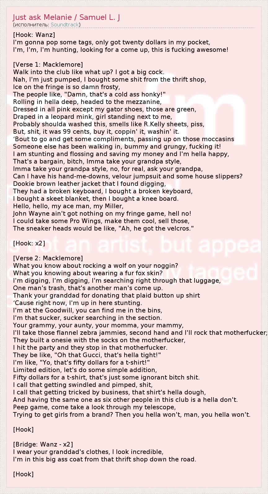 А как ты думаешь, о чем песня "Just ask Melanie / Samuel L. J" ?