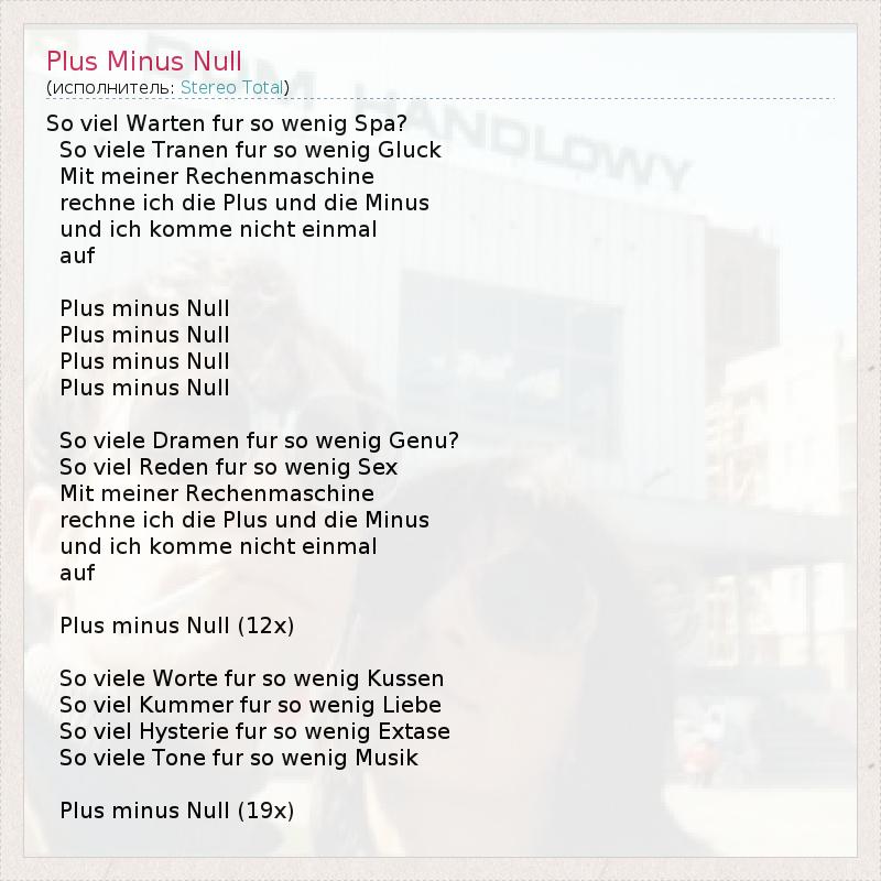 So viel Warten fur so wenig Spa? So viele Tranen fur so wenig Gluck Mit meiner Rechenmaschine rechne ich die Plus und die Minus und ich komme nicht einmal auf Plus minus Null Plus minus Null Plus minus Null Plus minus Null So viele Dramen fur so wenig Genu? So viel Reden fur so wenig Sex Mit meiner Rechenmaschine rechne ich die Plus und die Minus und ich komme nicht einmal auf Plus minus Null (12x) So viele Worte fur so wenig Kussen So viel Kummer fur so wenig Liebe So viel Hysterie fur so wenig Extase So viele Tone fur so wenig Musik Plus minus Null (19x)