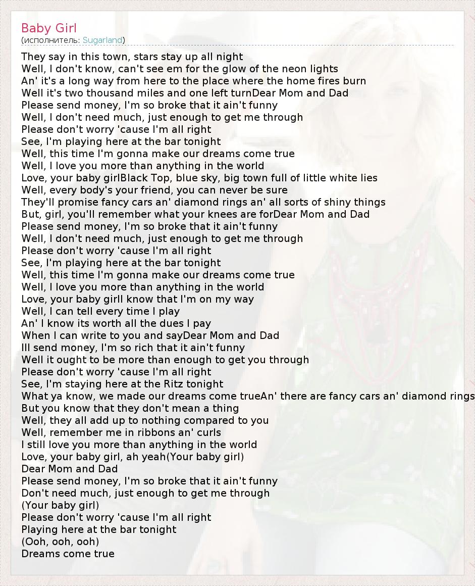 They say in this town, stars stay up all night Well, I don't know, can't see em for the glow of the neon lights An' it's a long way from here to the place where the home fires burn Well it's two thousand miles and one left turnDear Mom and Dad Please send money, I'm so broke that it ain't funny Well, I don't need much, just enough to get me through Please don't worry 'cause I'm all right See, I'm playing here at the bar tonight Well, this time I'm gonna make our dreams come true Well, I love you more than anything in the world Love, your baby girlBlack Top, blue sky, big town full of little white lies Well, every body's your friend, you can never be sure They'll promise fancy cars an' diamond rings an' all sorts of shiny things But, girl, you'll remember what your knees are forDear Mom and Dad Please send money, I'm so broke that it ain't funny Well, I don't need much, just enough to get me through Please don't worry 'cause I'm all right See, I'm playing here at the bar tonight Well, this time I'm gonna make our dreams come true Well, I love you more than anything in the world Love, your baby girlI know that I'm on my way Well, I can tell every time I play An' I know its worth all the dues I pay When I can write to you and sayDear Mom and Dad Ill send money, I'm so rich that it ain't funny Well it ought to be more than enough to get you through Please don't worry 'cause I'm all right See, I'm staying here at the Ritz tonight What ya know, we made our dreams come trueAn' there are fancy cars an' diamond rings But you know that they don't mean a thing Well, they all add up to nothing compared to you Well, remember me in ribbons an' curls I still love you more than anything in the world Love, your baby girl, ah yeah(Your baby girl) Dear Mom and Dad Please send money, I'm so broke that it ain't funny Don't need much, just enough to get me through (Your baby girl) Please don't worry 'cause I'm all right Playing here at the bar tonight (Ooh, ooh, ooh) Dreams come true