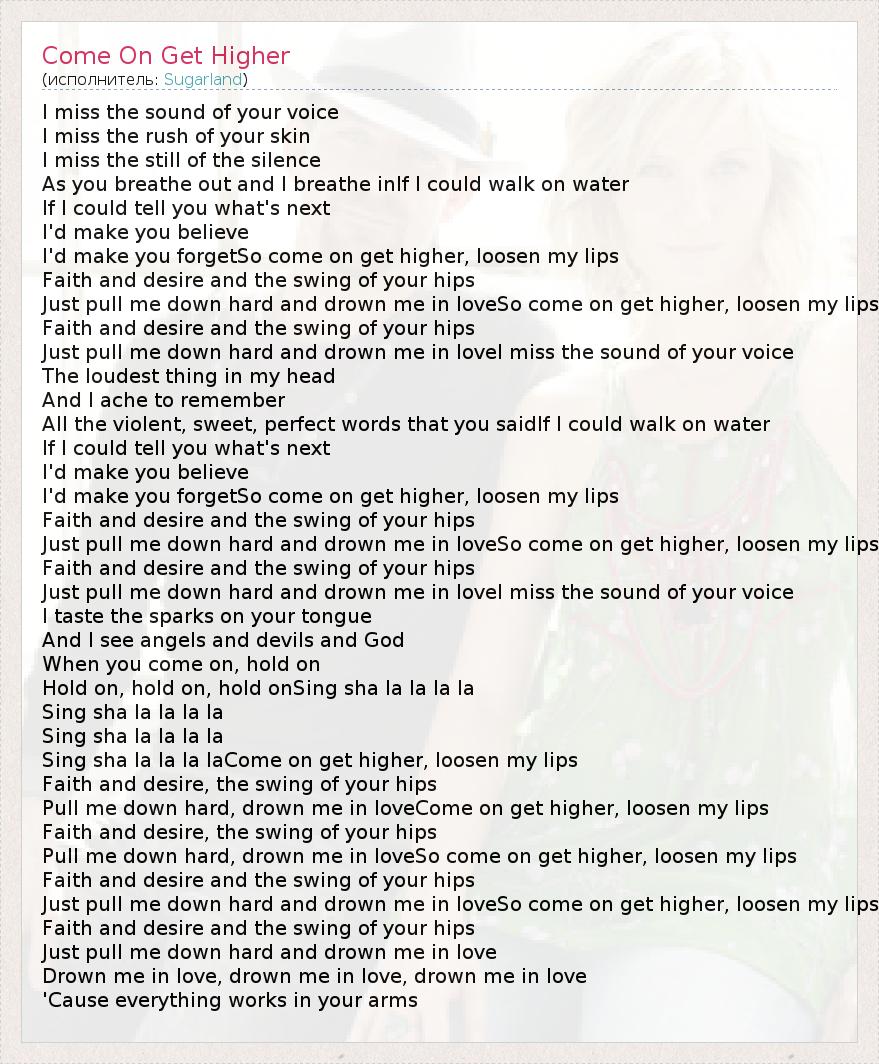 I miss the sound of your voice I miss the rush of your skin I miss the still of the silence As you breathe out and I breathe inIf I could walk on water If I could tell you what's next I'd make you believe I'd make you forgetSo come on get higher, loosen my lips Faith and desire and the swing of your hips Just pull me down hard and drown me in loveSo come on get higher, loosen my lips Faith and desire and the swing of your hips Just pull me down hard and drown me in loveI miss the sound of your voice The loudest thing in my head And I ache to remember All the violent, sweet, perfect words that you saidIf I could walk on water If I could tell you what's next I'd make you believe I'd make you forgetSo come on get higher, loosen my lips Faith and desire and the swing of your hips Just pull me down hard and drown me in loveSo come on get higher, loosen my lips Faith and desire and the swing of your hips Just pull me down hard and drown me in loveI miss the sound of your voice I taste the sparks on your tongue And I see angels and devils and God When you come on, hold on Hold on, hold on, hold onSing sha la la la la Sing sha la la la la Sing sha la la la la Sing sha la la la laCome on get higher, loosen my lips Faith and desire, the swing of your hips Pull me down hard, drown me in loveCome on get higher, loosen my lips Faith and desire, the swing of your hips Pull me down hard, drown me in loveSo come on get higher, loosen my lips Faith and desire and the swing of your hips Just pull me down hard and drown me in loveSo come on get higher, loosen my lips Faith and desire and the swing of your hips Just pull me down hard and drown me in love Drown me in love, drown me in love, drown me in love 'Cause everything works in your arms