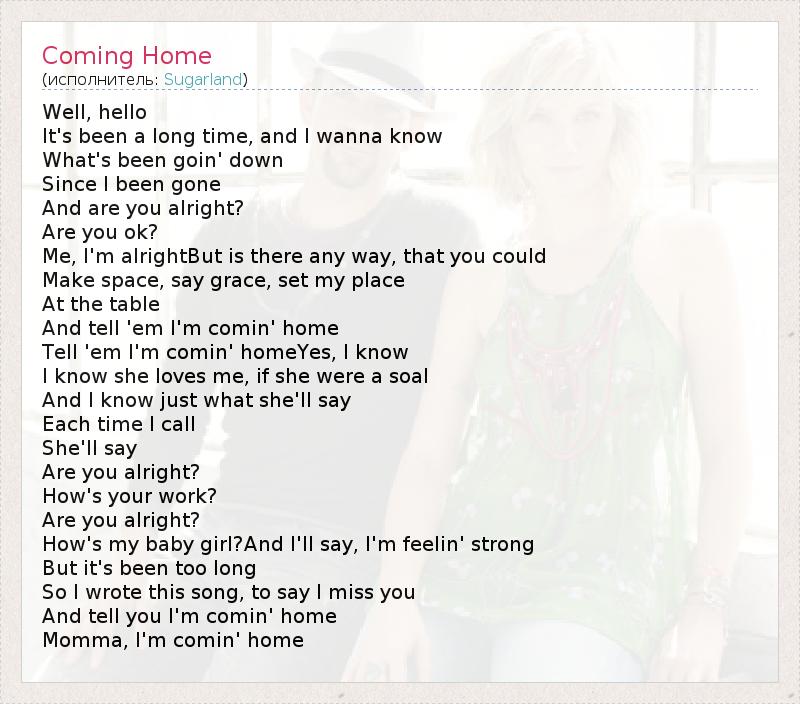 Well, hello It's been a long time, and I wanna know What's been goin' down Since I been gone And are you alright? Are you ok? Me, I'm alrightBut is there any way, that you could Make space, say grace, set my place At the table And tell 'em I'm comin' home Tell 'em I'm comin' homeYes, I know I know she loves me, if she were a soal And I know just what she'll say Each time I call She'll say Are you alright? How's your work? Are you alright? How's my baby girl?And I'll say, I'm feelin' strong But it's been too long So I wrote this song, to say I miss you And tell you I'm comin' home Momma, I'm comin' home